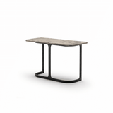 The console is offered with a travertine top or a teak heritage brown top, each paired with a patinated steel base. The contrast between the natural surface and the subtly aged steel adds depth and character, without overpowering the space. Aspen console is a quiet statement piece, grounding interiors with warmth, texture, and understated elegance.