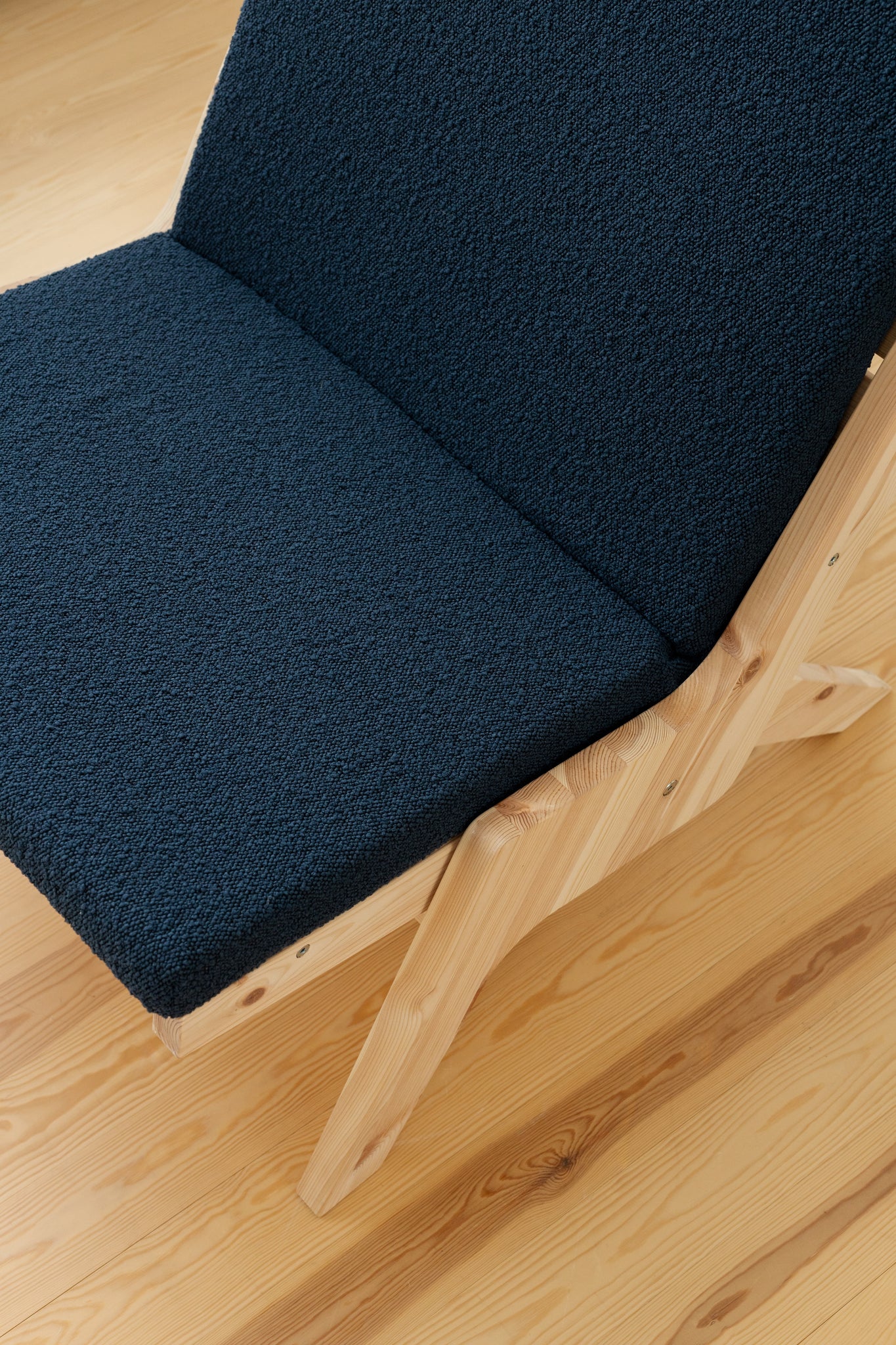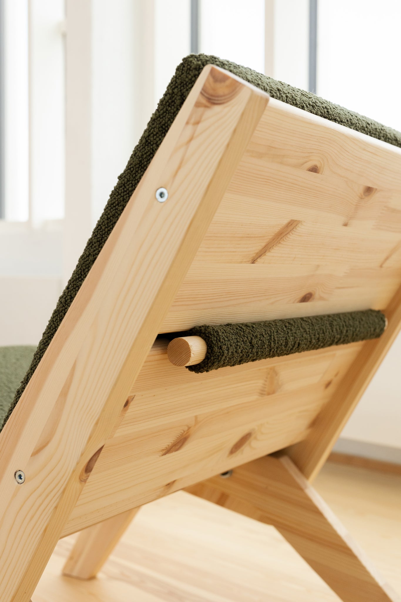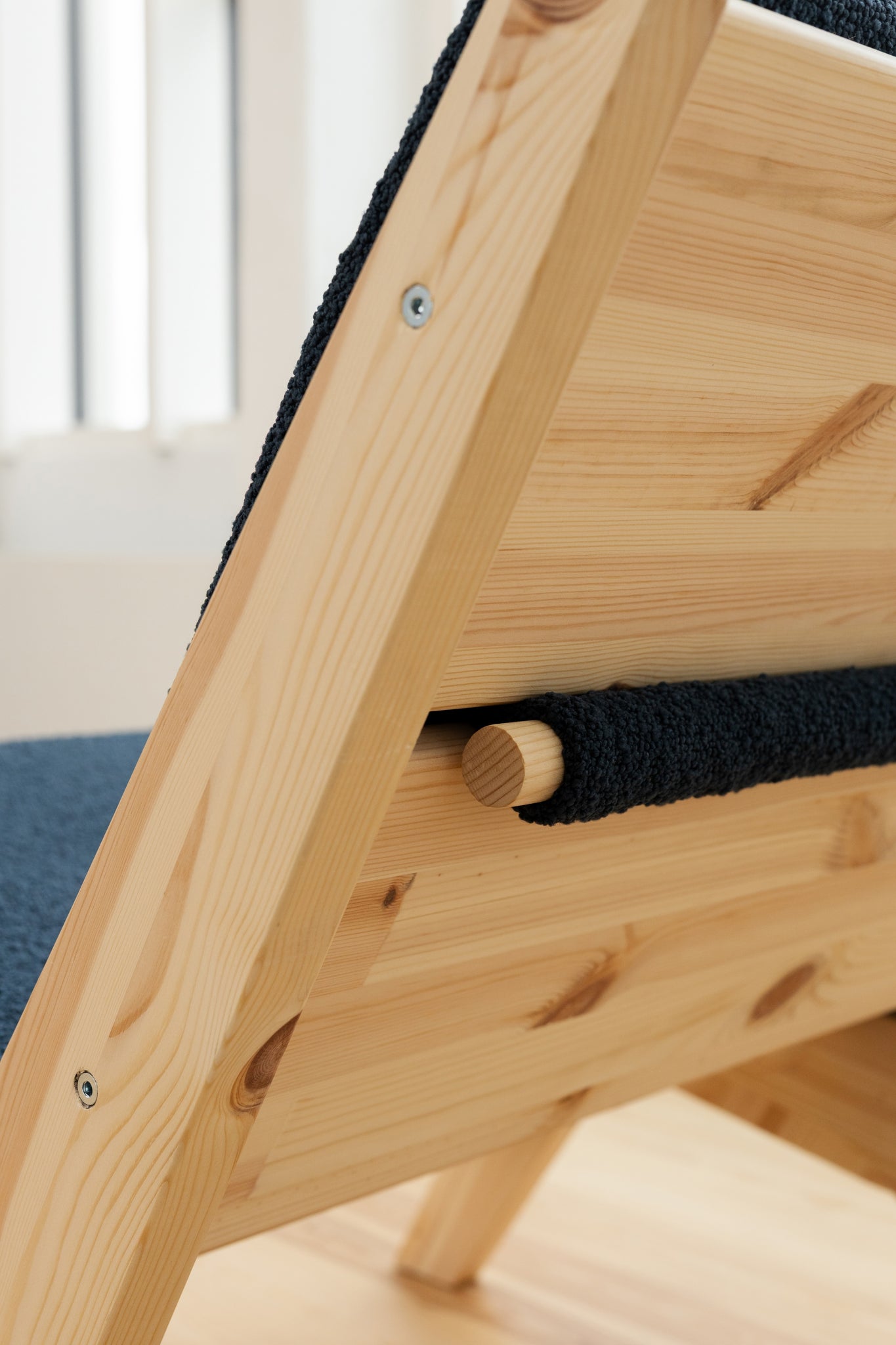 The continuous upholstery is elegantly drawn through the backrest and secured with a round stick, which highlights the craftsmanship and attention to detail and emphasizes the chair's honest construction. The soft bouclé upholstery adds character and warmth to the mattress and can be easily removed and washed, so the chair always looks inviting.