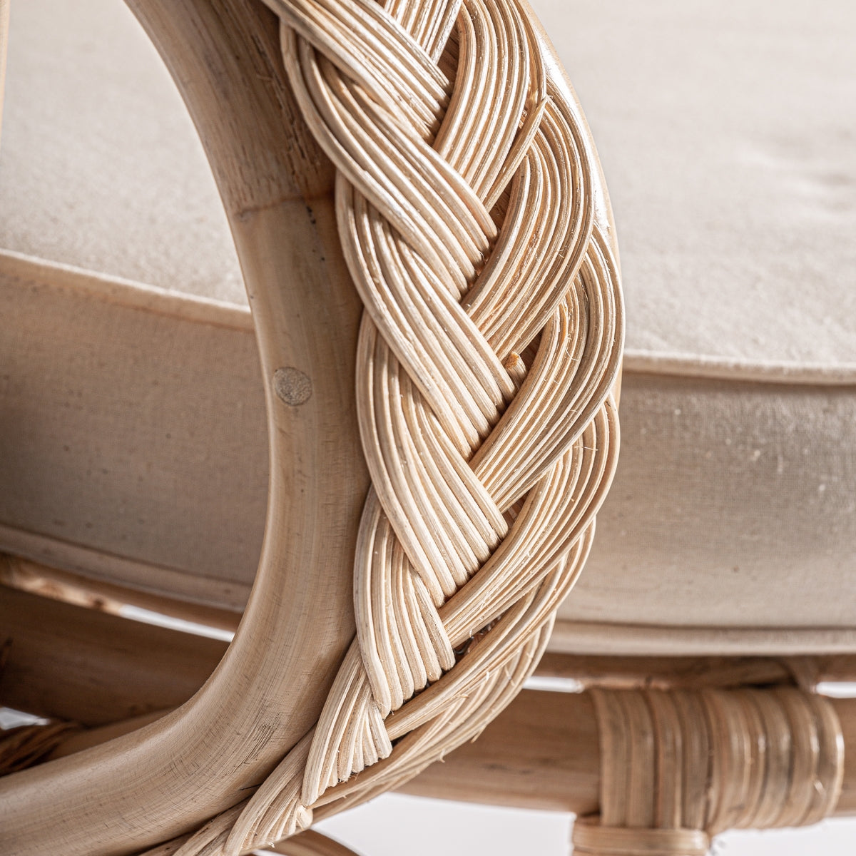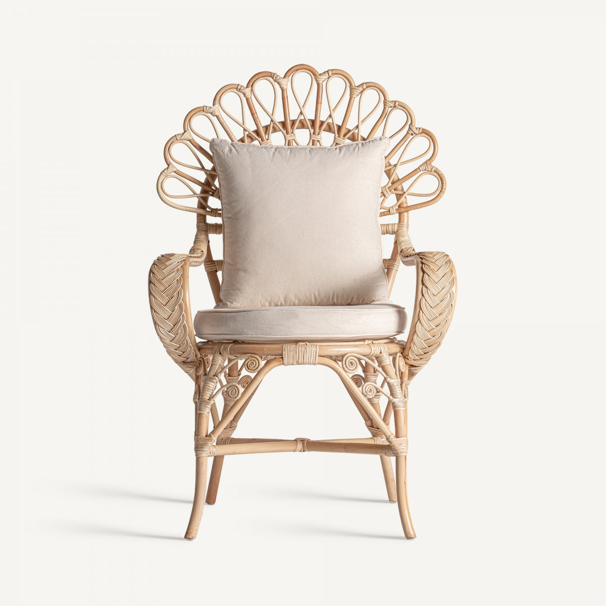 UNIQUE PIECE COMPOSITION Rattan combined with cotton. DIMENSIONS Measurements (length x width x height): 76 x 65 x 114 cm. Weight: 6,0 kg. Legs dimensions: 3X3X17 cm. Seat size: 48X48X7 cm. Height floor to seat: 54 cm. Height floor to armrest: 67 cm. Backrest size: 43X4X62 cm. Supported