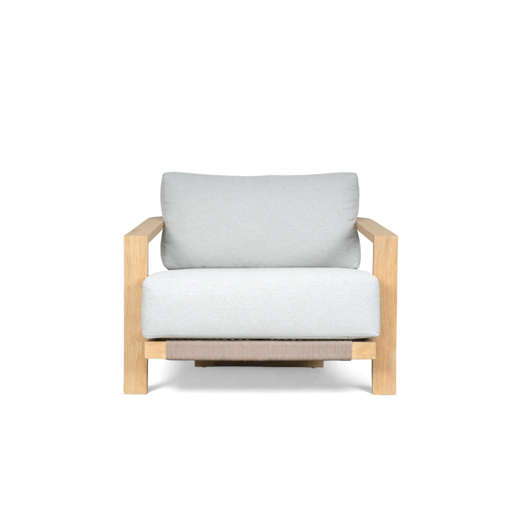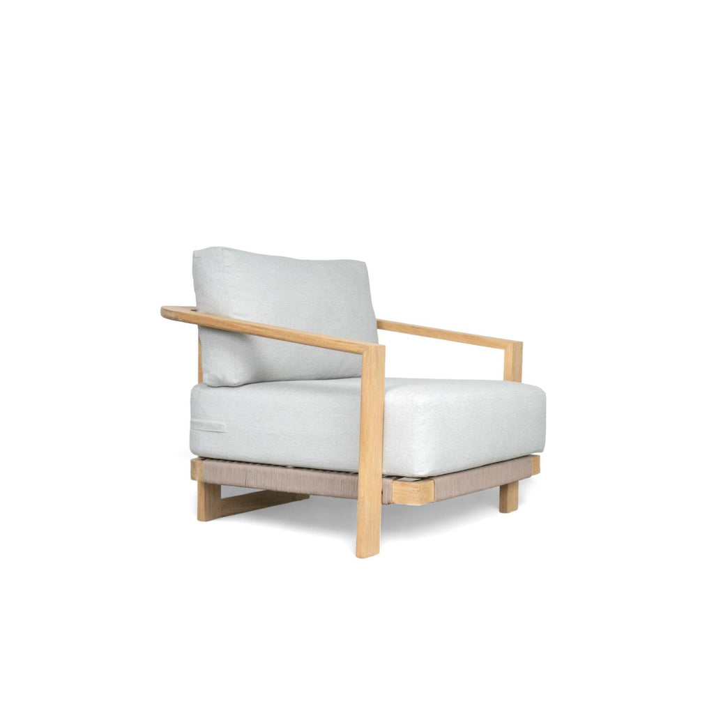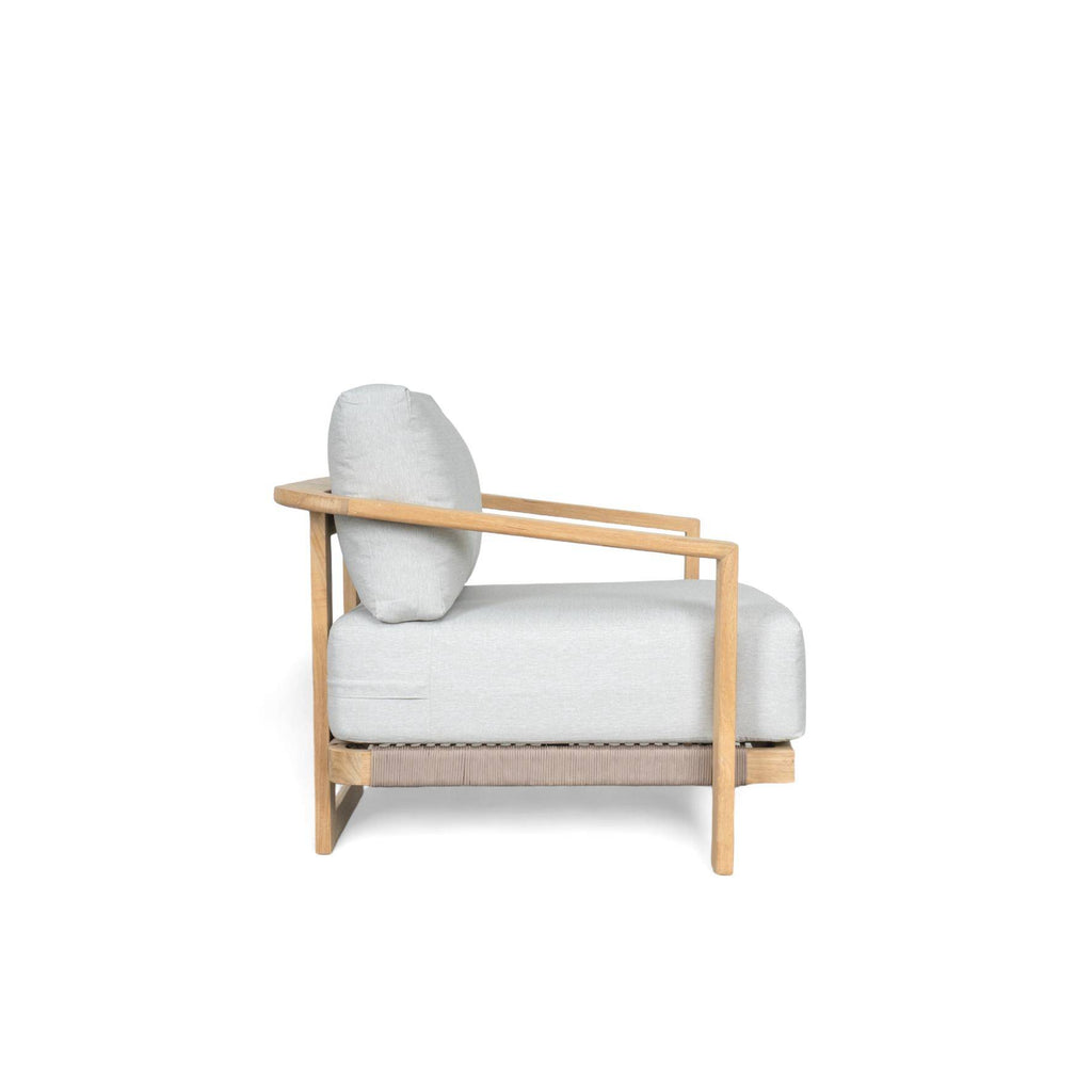 Imagine sinking into the Moss Lounge Armchair, where plush cushions, solid teak, and natural-colored rope create a cozy retreat for indoor and outdoor relaxation.