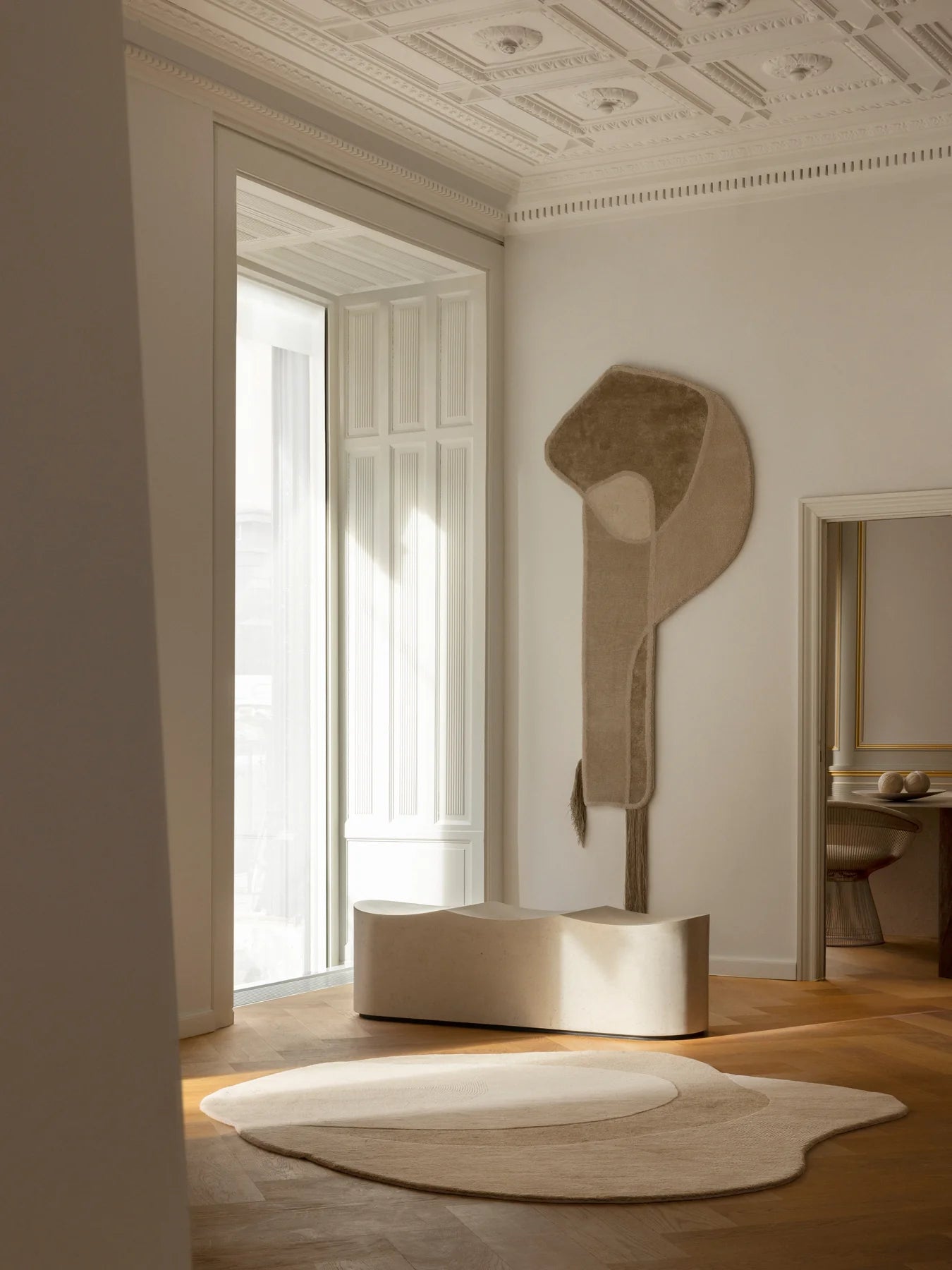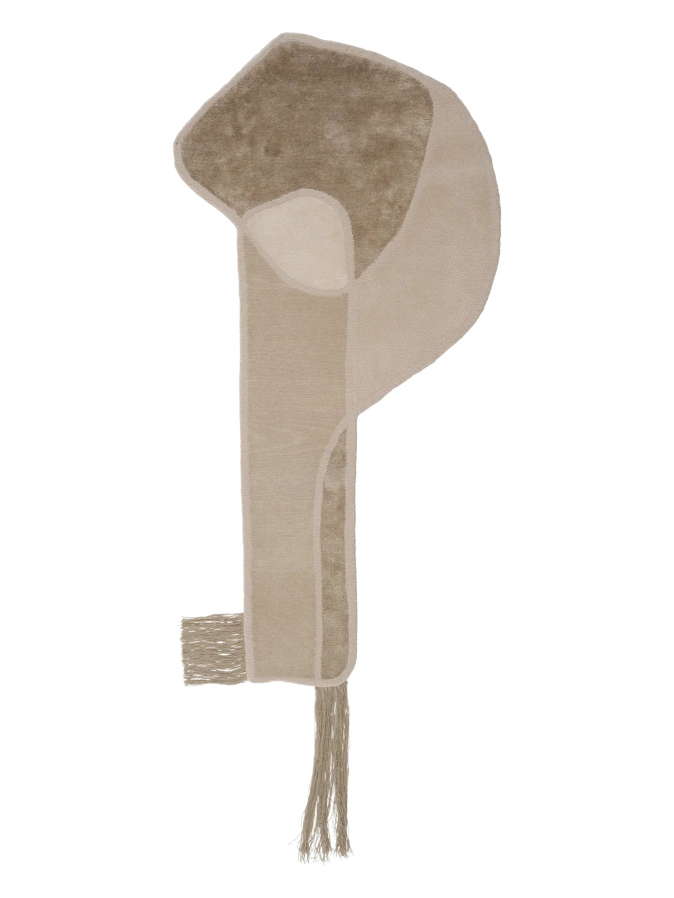 The interaction between the course of the lines and the surface materials creates a soft tactility that is beautifully framed by the organic outline and fringing details. The mix of wools from New Zealand and Argentina with the lustrous silk and rustic linen creates textural contrasts that are balanced by harmonious tones, creating an original and luxurious rug that elevates any interior.