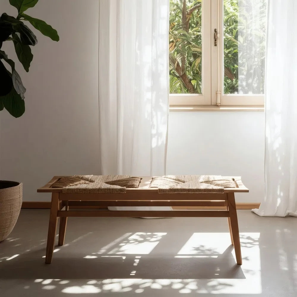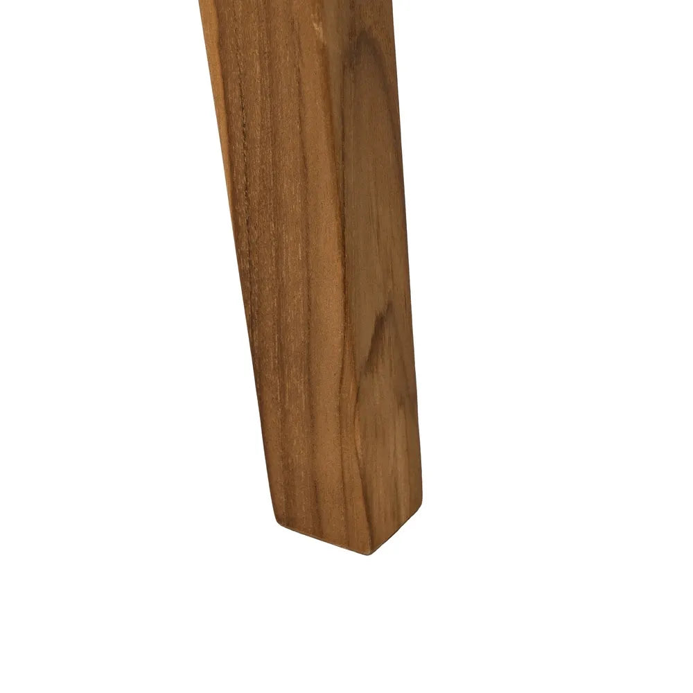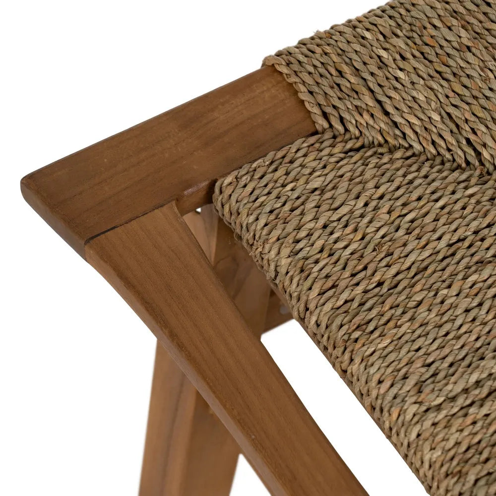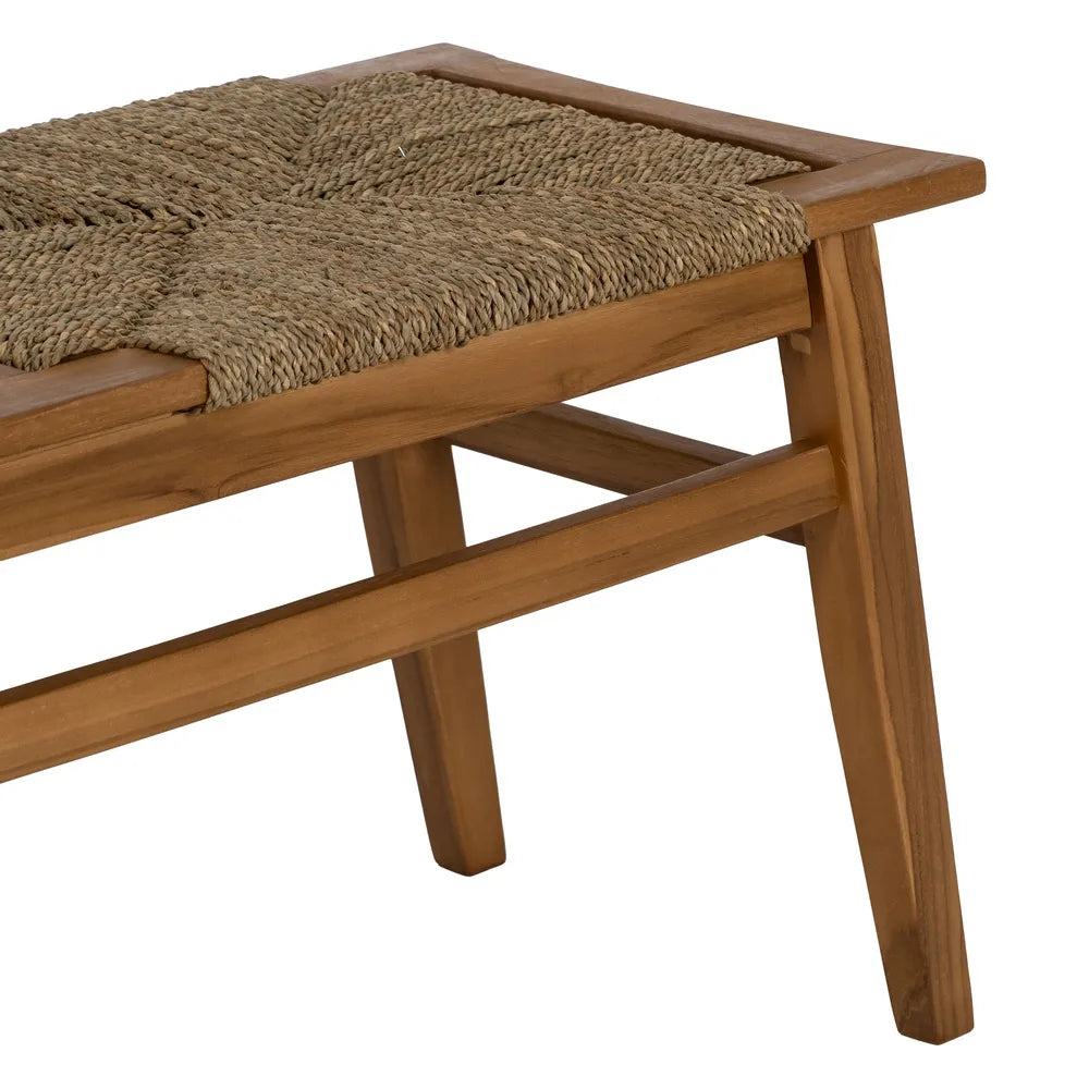TEAK BENCH WITH MENDONG SEAT. Assembly required. Complies with European standard UNE-EN 12520:2015. Leg height: 43 cm.
