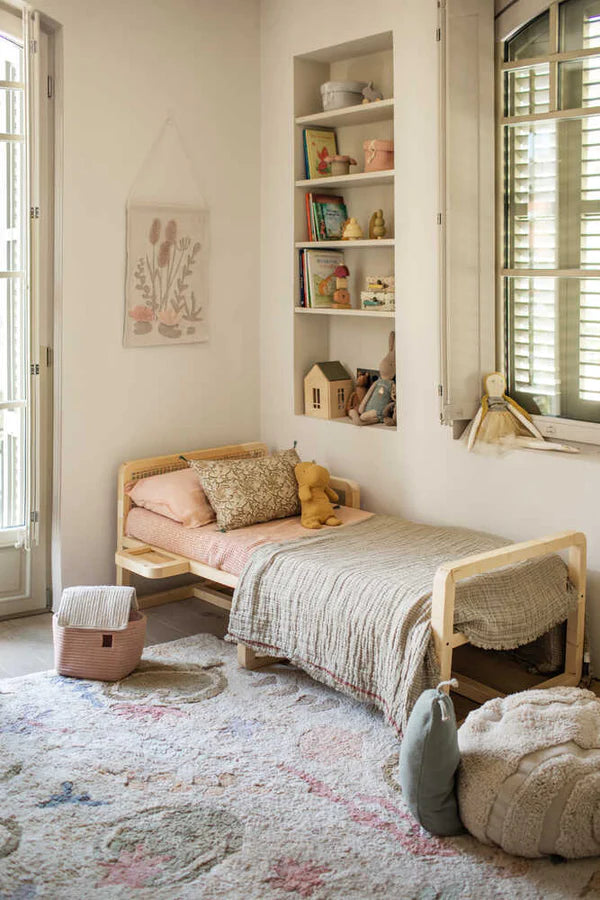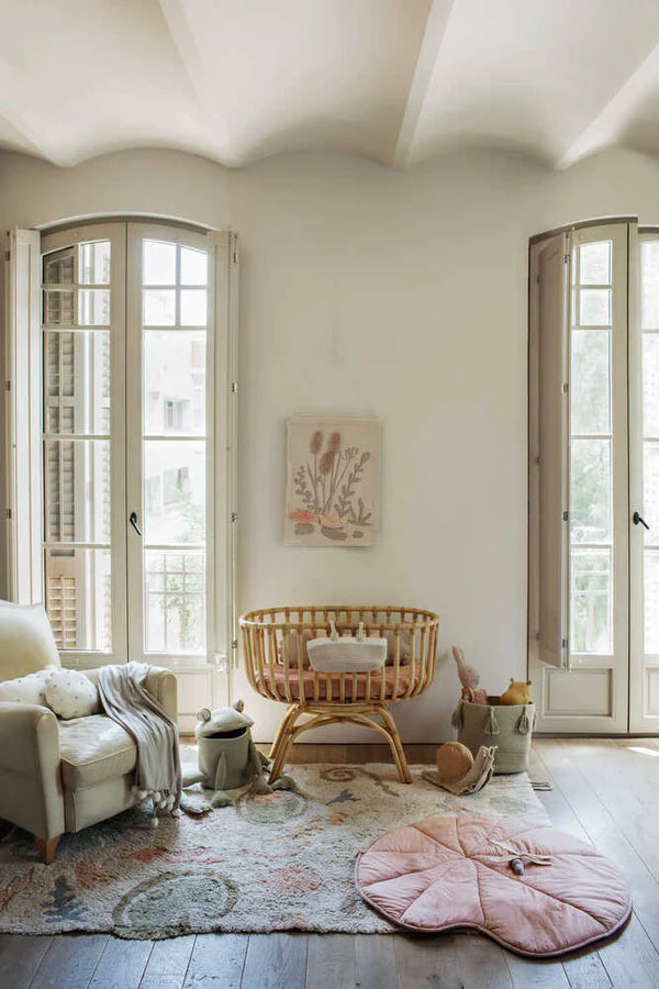 A magical world of bloom & buzz on a rug! Little ones can step into a pond fantasy world with this pastel-colored washable cotton rug that brings a piece of nature indoors, including a pet frog and snail! Children can use them to interact with the rug’s print and bring it to life through imagination. Fred the Frog and Lazy Snail will keep them company as they play along. It makes the ideal rug for a kids’ room decor with a touch of botanic fantasy.