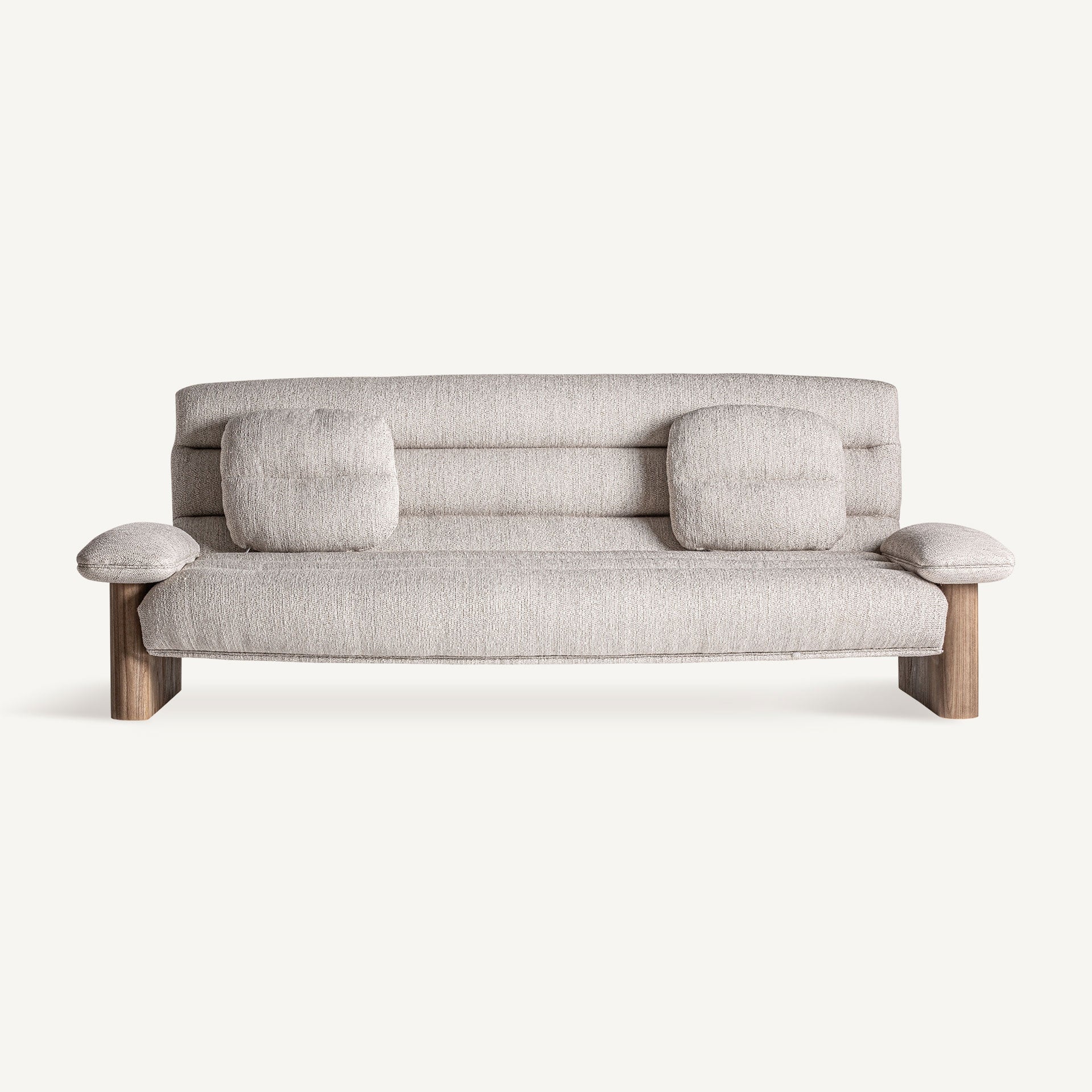 The Jacquard sofa designed by estudi{H}ac, prioritizes comfort with a contemporary formal language. Its brown oak frame and beige upholstery make it ideal for living rooms with personality.
