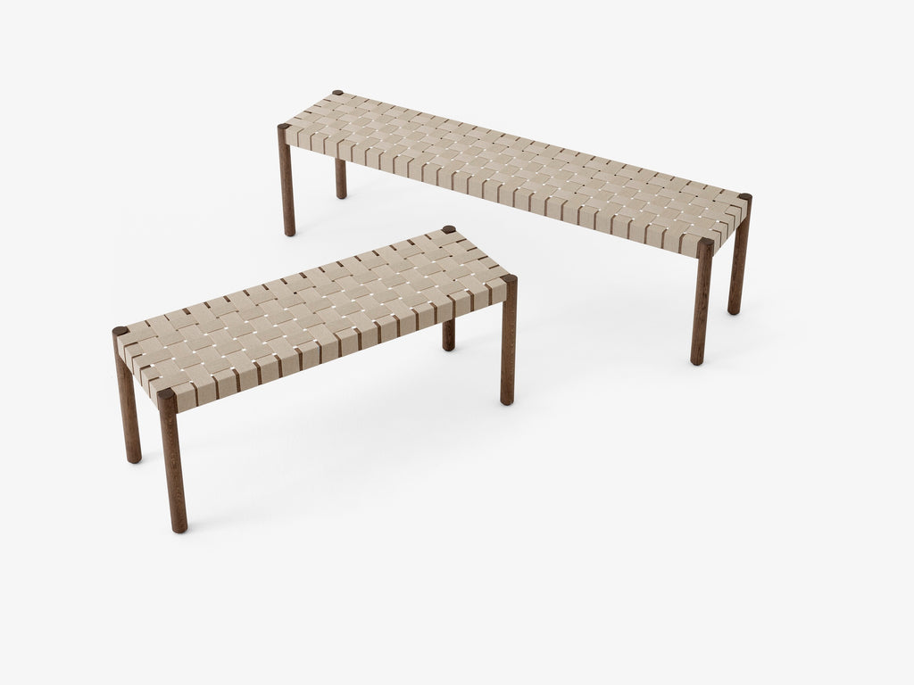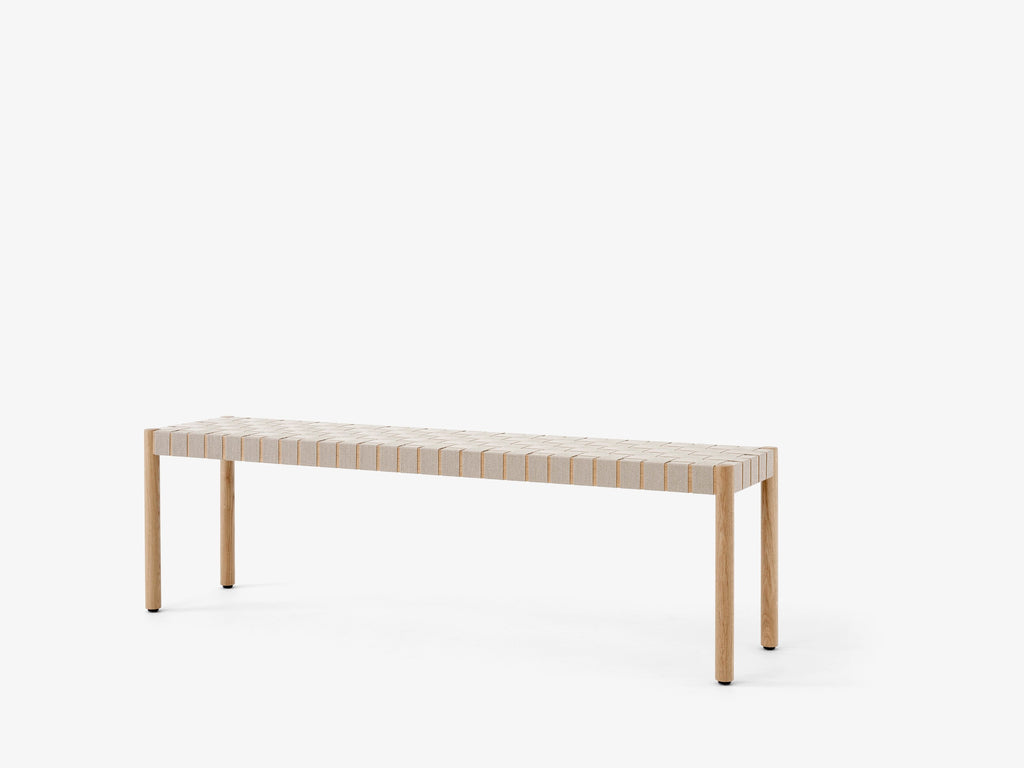 Named after the Betty Nansen theatre in Copenhagen, this bench is made from exposed webbing hand-crafted from natural linen fibres. Its solid oak frame is available in three contemporary colours: Black lacquered ash, Maroon lacquered ash and Lacquered solid oak with natural webbing, as well as a version in Black lacquered ash with black webbing. It comes in two lengths: 105cm and 157cm.
