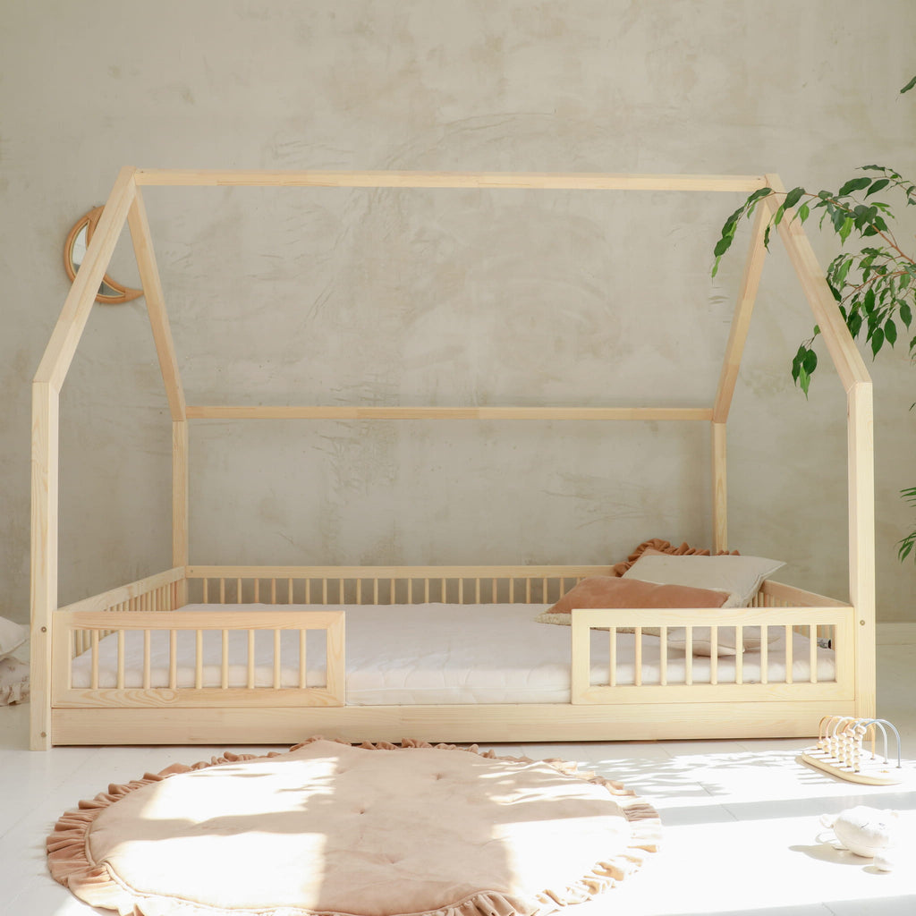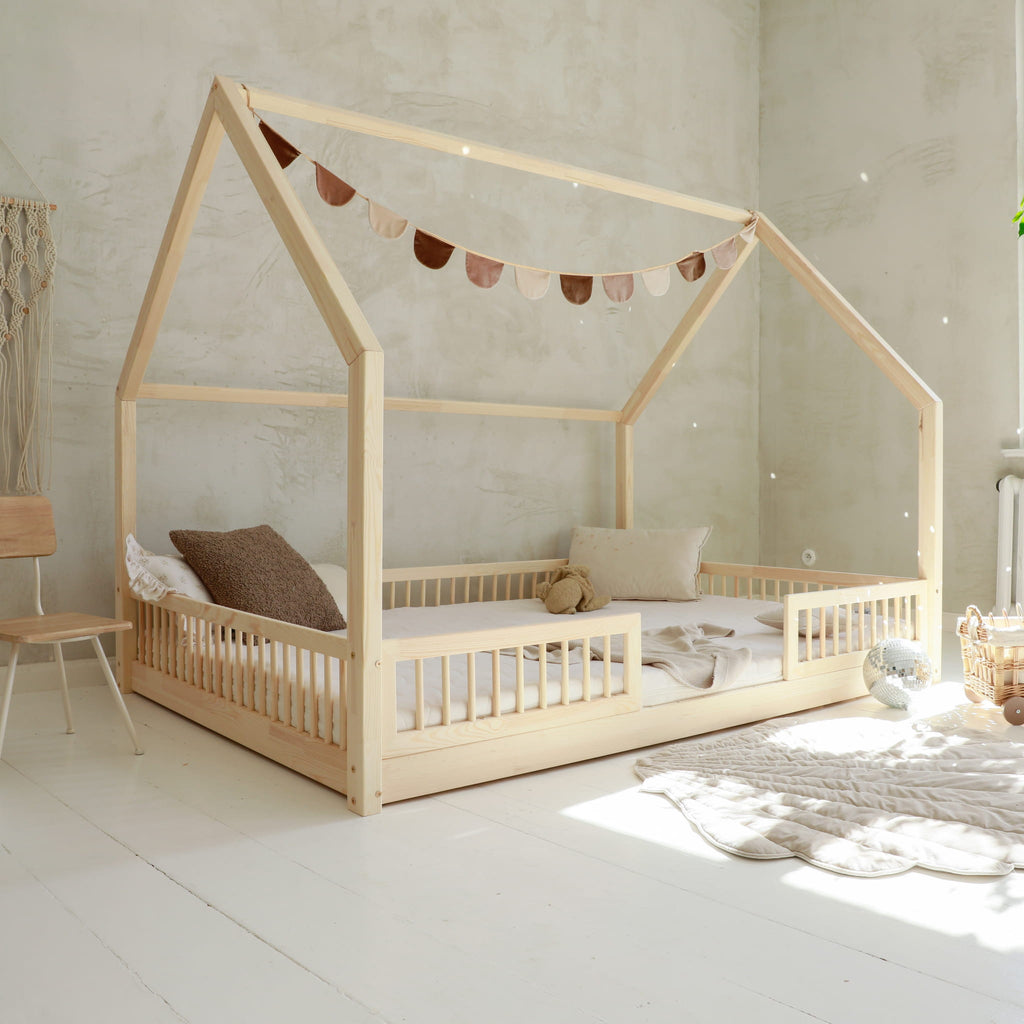 The PIOLI DUO house bed is a Scandinavian style bed.The bed is made of glue-laminated pine wood. Sanded smooth, with rounded shapes.This model is available in size 200/140 in natural wood colour.The natural wood version is the non-treated (unprotected) wood option.