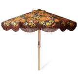 A generous shield from the summer sun, this monochrome striped patio umbrella offers refreshing shade for your outdoor enjoyment. The rich deep brown and off-white stripes, paired with a decorative border, give the umbrella a timeless, classic appeal.