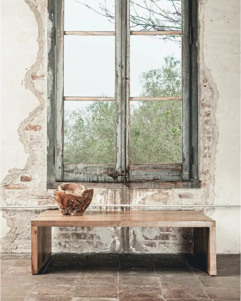 Both the top and the legs are made of planks of the same thickness, precisely dovetailed together. The result is a sober and continuous design that gives the impression of a single piece.