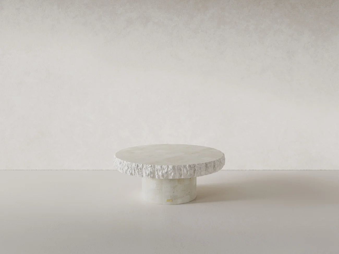 The Orilla Coffee Table is a square coffee table featuring a polished fossil stone tiled surface and incredible rough textured edge profile.