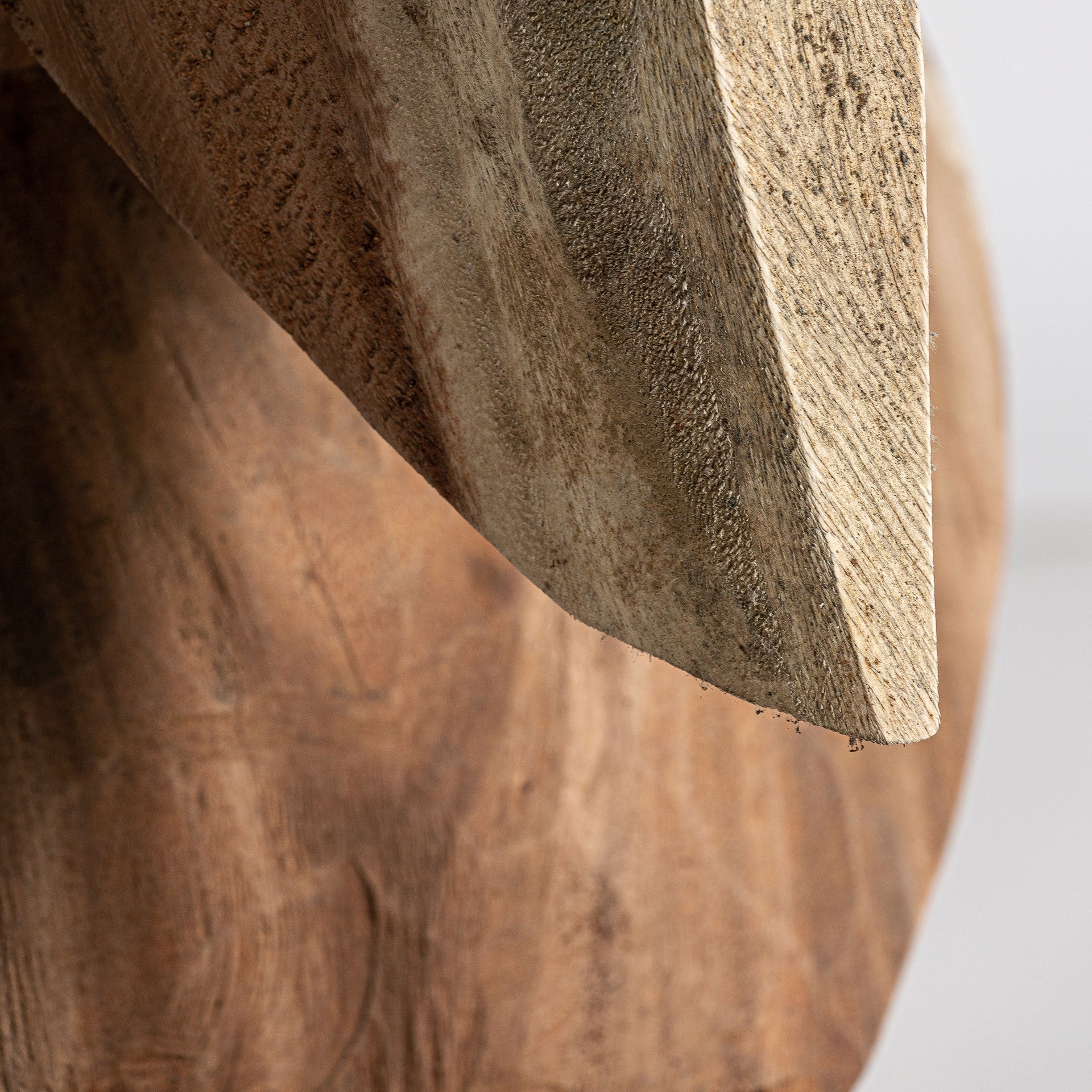 The Harper sculpture, in brown teak wood, stands out for its natural finish and organic shapes.