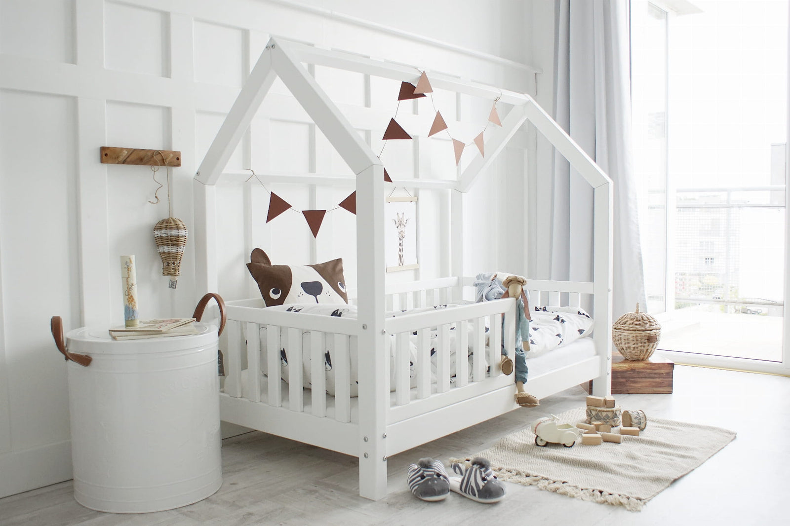 Buying the BIANCO you get a complete bed frame with a base for a mattress, vertical beams, a mini-roof and the set of rails presented in the photos.