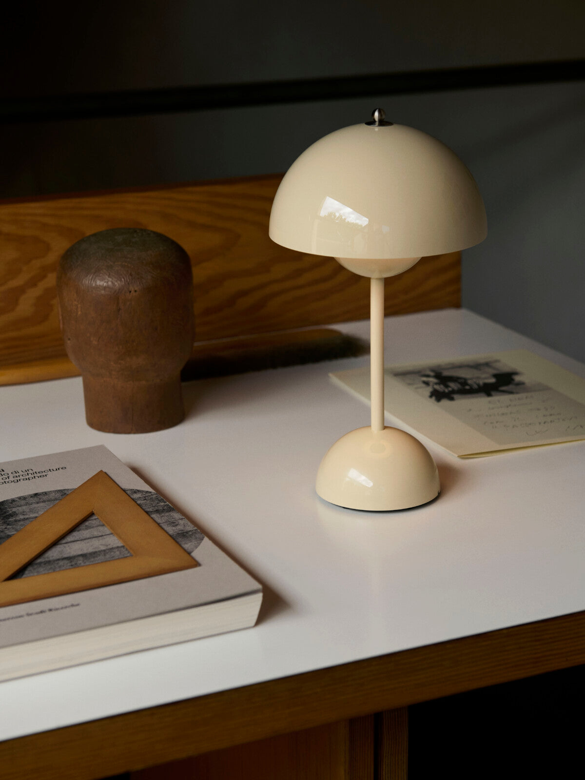 The Flowerpot, a vividly coloured lamp with a rounded pendant that hangs from the semi-domed upper shade, embodies the experimental attitude of Verner Panton. Slightly smaller in size than the table lamp version, and deliberately lightweight, the portable VP9 comes equipped with a USB charging cable. It is available in a wide range of contemporary colours and will bring a cozy atmosphere to indoor and outdoor settings.