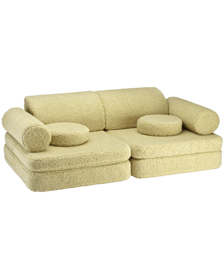 The Wigiwama Settee comes in 9 parts - two seat cushions, one big seat cushion, two triangular cushions as backrests, two roll cushions as armrests, and two round cushions - providing a perfect combo with limitless potential for imaginative play and relaxation.
