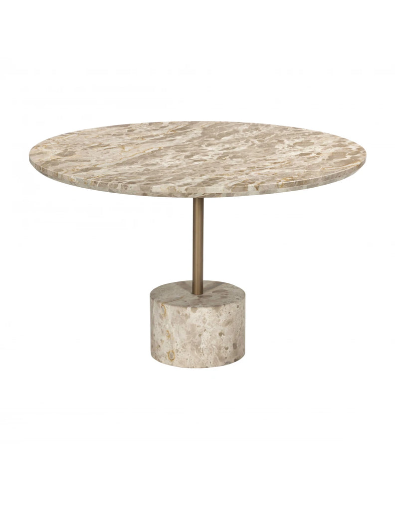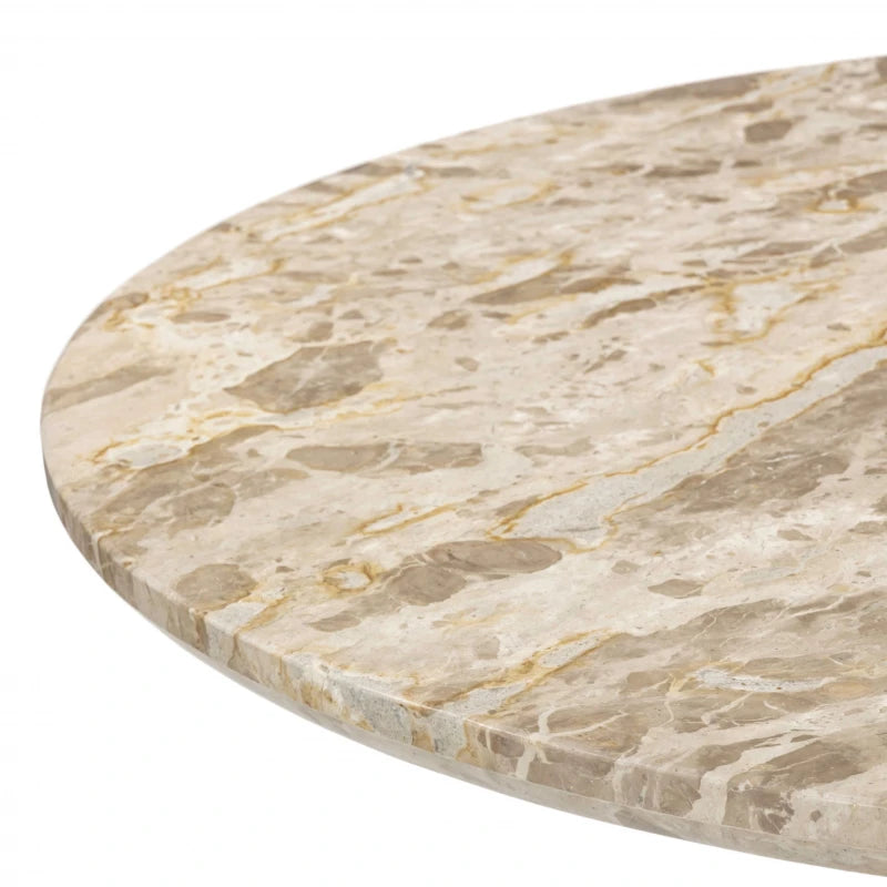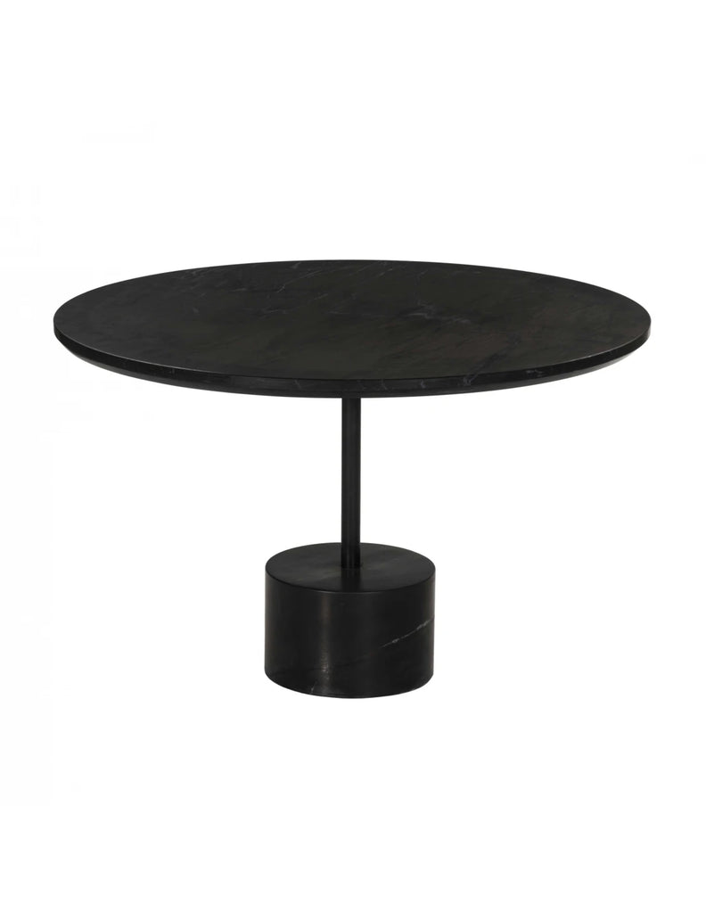 Moss dining table with a black or natural phanther top with visible grain and a metal center base. A sophisticated and contemporary design for residential dining rooms or contract spaces.