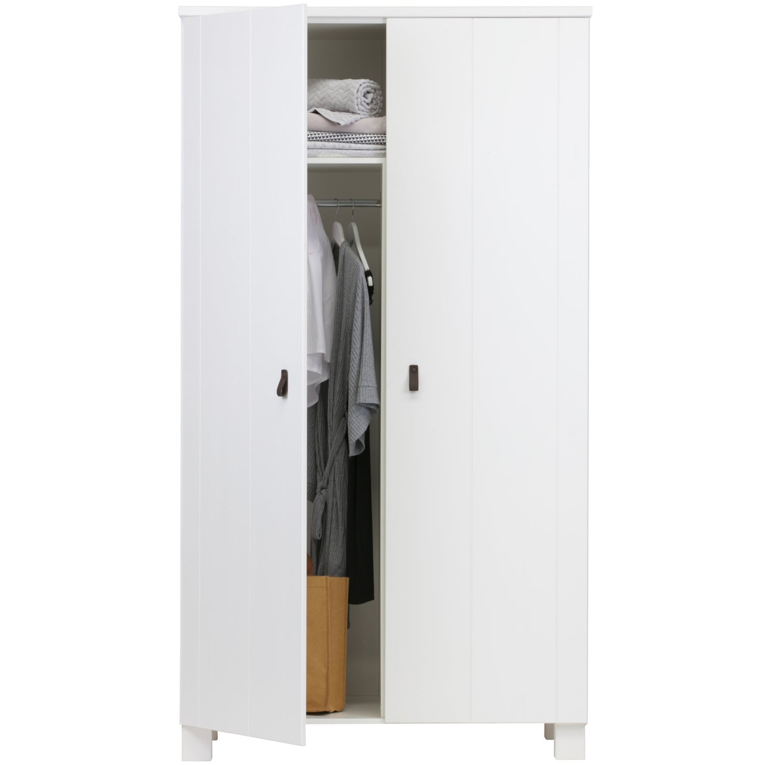 The interior of the wardrobe is made of melamine and consists of one wide shelf at the top with a divided rod on the left and three divided shelves on the right. The door is equipped with leather handles in the color brown. The Ties wardrobe is available in white and deep black (RAL9005).