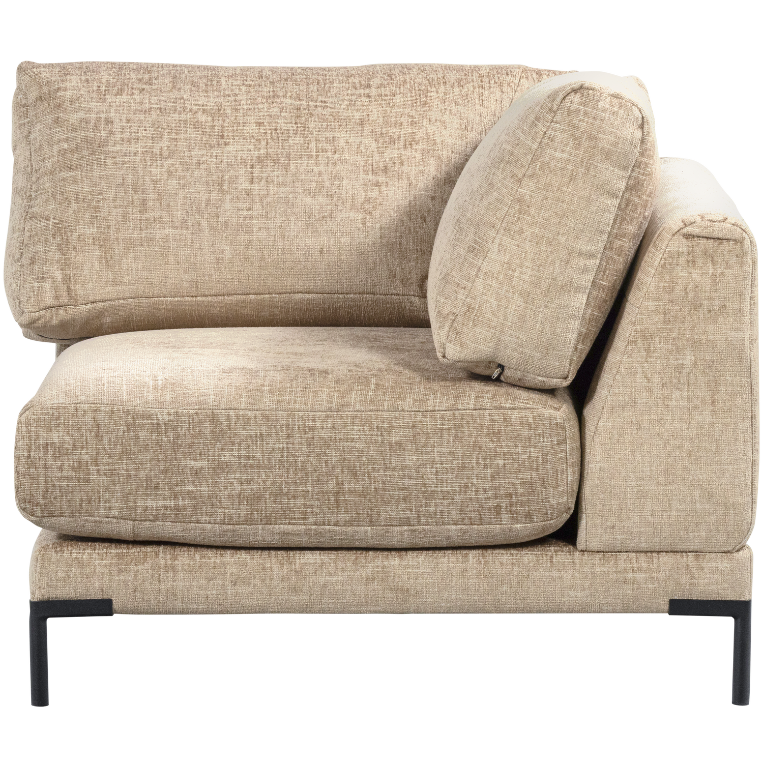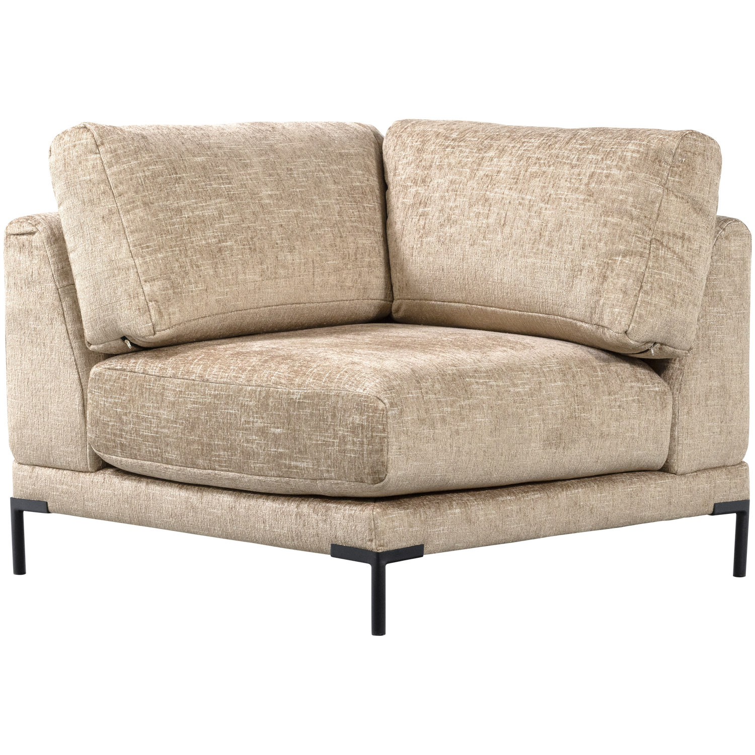 Part of the vtwonen Couple series Airy design through the high, stylish leg Upholstered with a coarsely woven chenille fabric H 89 cm x W 100 cm x D 100 cm Expand, slide and rearrange. With the Couple element series from vtwonen, you create the ultimate in flexible seating. The stylish design is emphasised by the high, black leg with a cylinder shape. The comfortable cushions are upholstered in a and coarsely woven fabric that feels extra soft to the touch thanks to the woven chenille. Choose from one of eleven timeless colours/fabrics, or opt for a combination of the earthy tones to create an extravagant seating area. Place, pair, ready! Material Our Alet chenille has a striking and coarse texture, which makes this fabric truly unique. The soft fabric is made of a special composition. For example, the chenille consists of polyester, cotton and viscose, among others. The Alet chenille with irregular weave pattern has a Martindale of 30,000 and is suitable for fairly intensive use. In addition, the Alet has a luxurious light reflection. Dimensions Height: 89 cm Width: 100 cm Depth: 100 cm Seat height: 44 cm Seat width: 57 cm Seat depth: 57 cm Armrest width: 24 cm Leg height: 13 cm Leg thickness: 2.5 cm Load capacity: 90 kg Weight: 47 kg Maintenance In case of stains, it is recommended to dab the fabric with a slightly damp white cloth and a neutral furniture shampoo. Definitely do not rub! On the favourite seat, a shiny seat surface may appear after some time. Vacuum articles with this fabric weekly. Delivery The Couple elements are delivered individually. The elements are easy to connect with the alligator connectors already fitted. To protect hard floors, place felt glides on the underside of the legs.