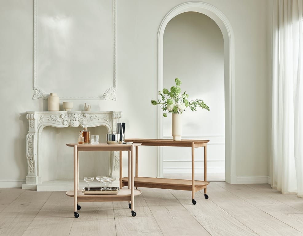 Coupe is an elegant low shelf, functioning equally well as flexible storage and as a bar- or serving trolley. Designed with wheels to be easily moved from kitchen to dining room to living room – or wherever your dinner party ends up! The rounded shelves feature a beautifully smooth rim that keeps objects in place making it perfect for styling trays, books and décor. A stylish and functional design for any room.