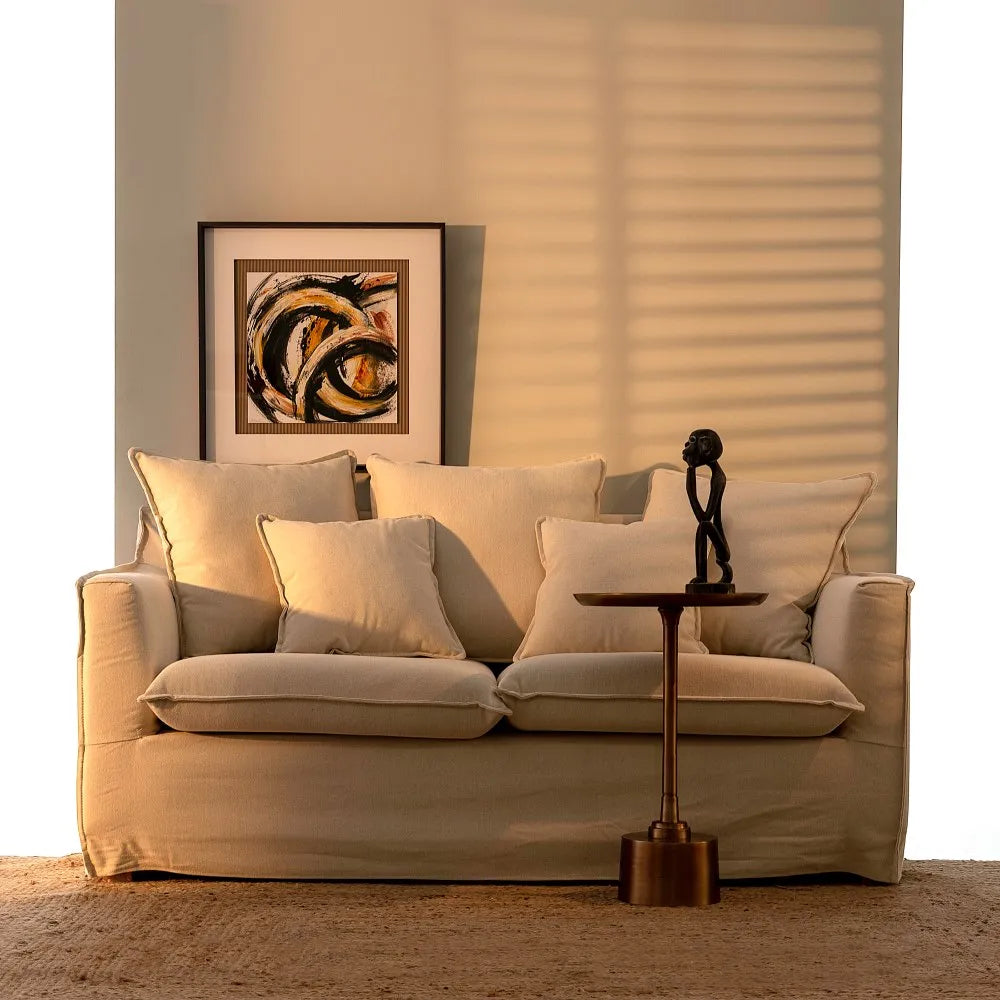 REMOVABLE CUSHION COVER. FABRIC: 60% COTTON, 40% LINEN. STRUCTURE: PINE WOOD AND CHIPBOARD. SEAT HEIGHT: 47CM. ARMREST HEIGHT : 13C M. SEAT CUSHION FILLING: FOAM, DENSITY 28kg/m3. BACKREST CUSHION FILLING: 100% FIBER. 2 CUSHIONS INCLUDED LEG HEIGHT: 11CM SEAT DEPTH: 62CM SEAT WIDTH: 145CM