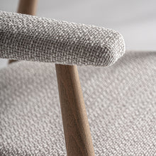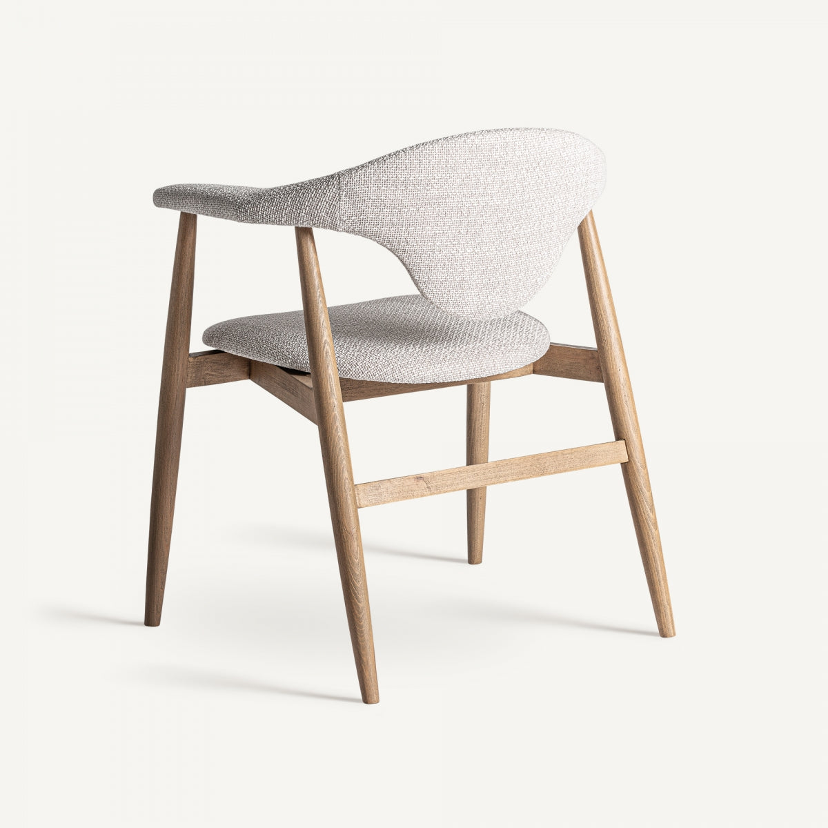 Made of beech wood in light brown matte colour, combined with foam and polyester in grey marbled colour.