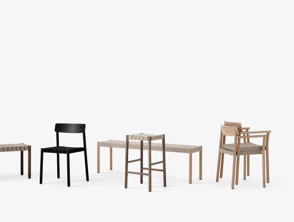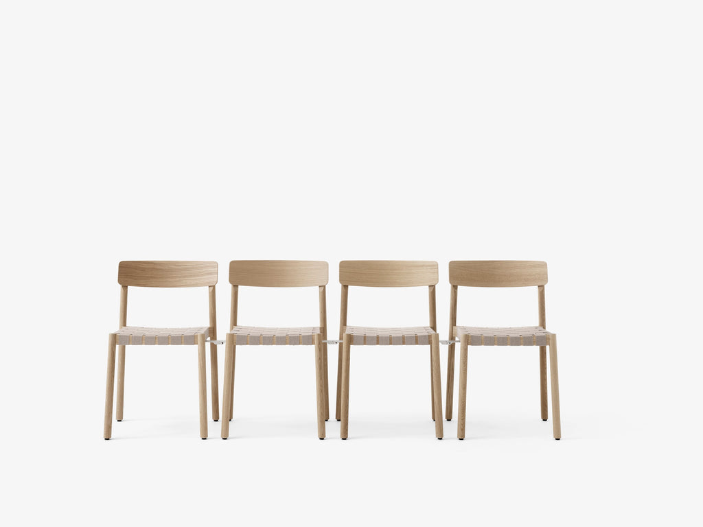 Named after the Betty Nansen theatre in Copenhagen, this stackable chair comes in two versions: one with a seat made from exposed webbing crafted from natural linen fibres, and another with a solid wooden seat. It is available in four colour combinations: Lacquered Solid Oak with natural webbing, Black Lacquered Ash with natural webbing, Black Lacquered Ash with black webbing, and Smoked Oiled Oak with natural webbing.