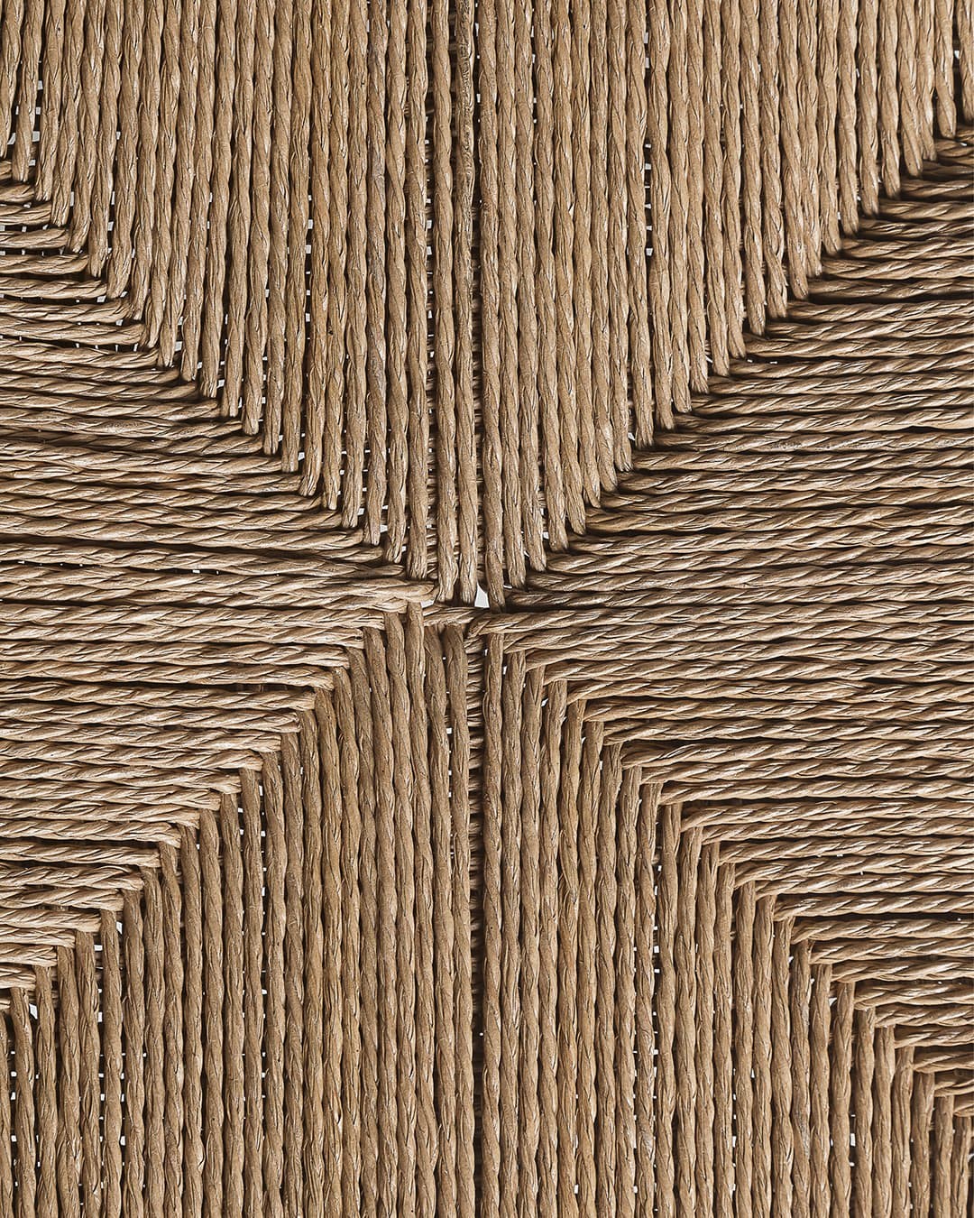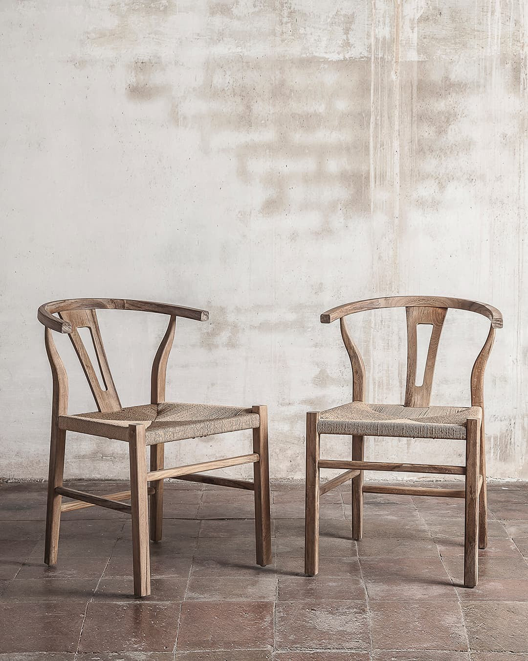 Iconic, undisputed, essential. The dining chair, made of natural teak, combines design, lightness and aesthetics, and is one of our best sellers. This comfortable, elegant and modern designer chair stands out for its minimalistic, curved shapes with the arch-shaped backrest being the focal point. The structure is made of natural teak, and the rope has been hand-woven by our skilled craftsmen, thus providing a unique and traditional touch to the design. Due to its timeless and classic aesthetic, it fits into any style and combines perfectly with different dining room furniture pieces, in the same natural tone or of another color.