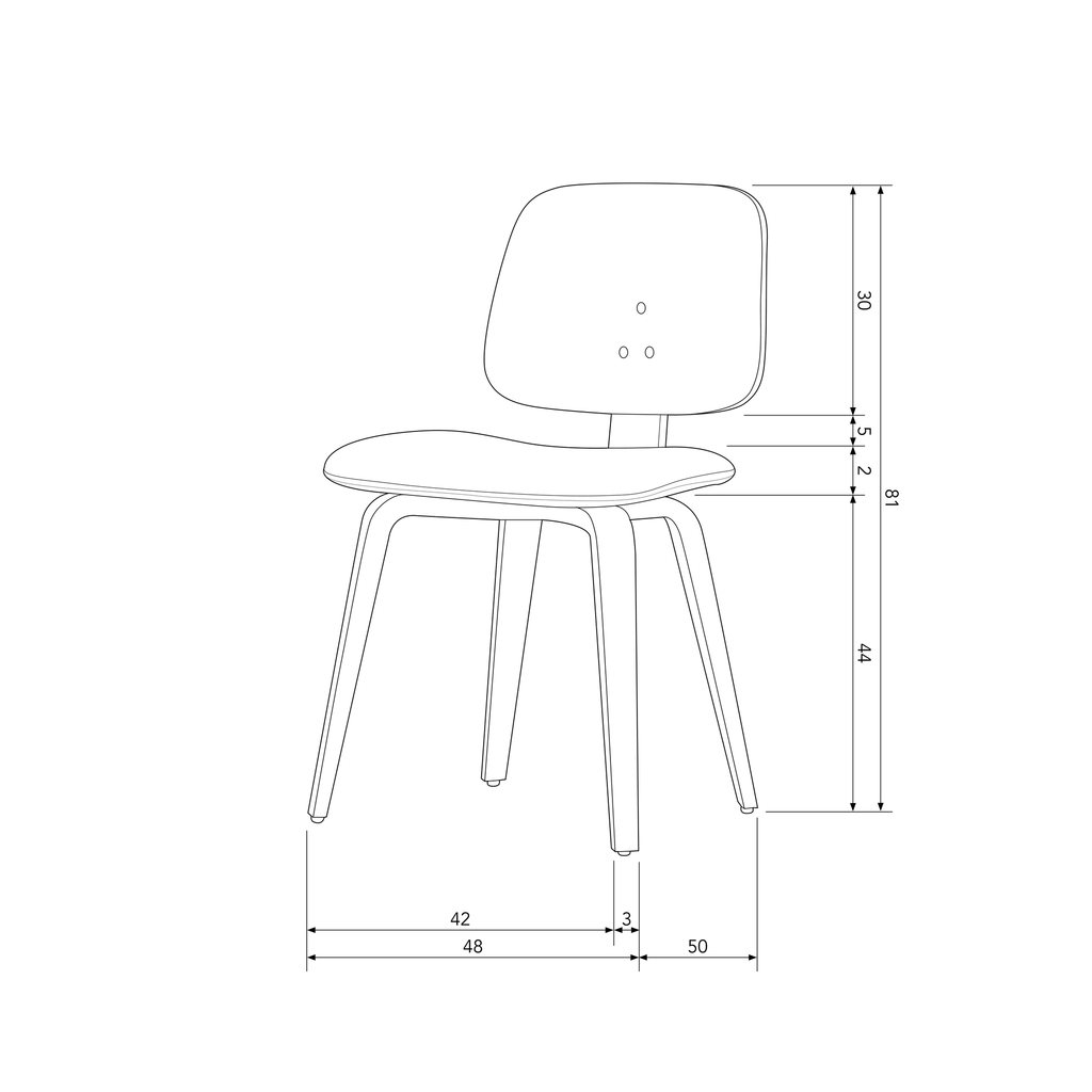 Dimensions - Height: 81 cm - Width: 48 cm - Depth: 50 cm - Seat height: 48 cm - Seat width: 46.5 cm - Seat depth: 40 cm - Backrest height: 40/81 cm - Backrest width: 40 cm - Backrest thickness: 1.5 cm - Leg height: 44.5 cm - Leg width: 4.5 cm - Leg thickness: 3 cm - Seat thickness: 2 cm - Load capacity: 130 kg - Weight: 4,8 kg