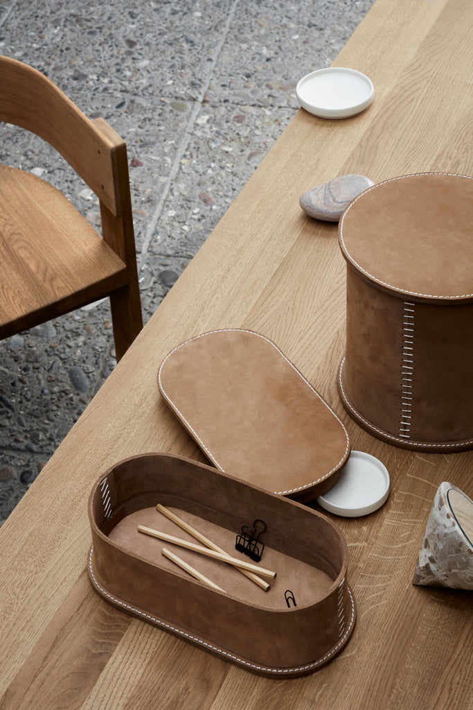 Colour & Material Warm Lacquered Oak, Walnut & Cognac Nubuck Leather