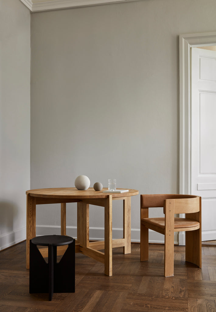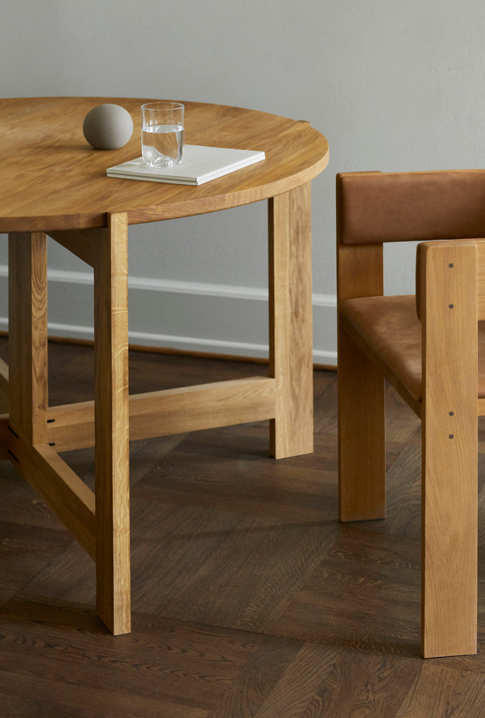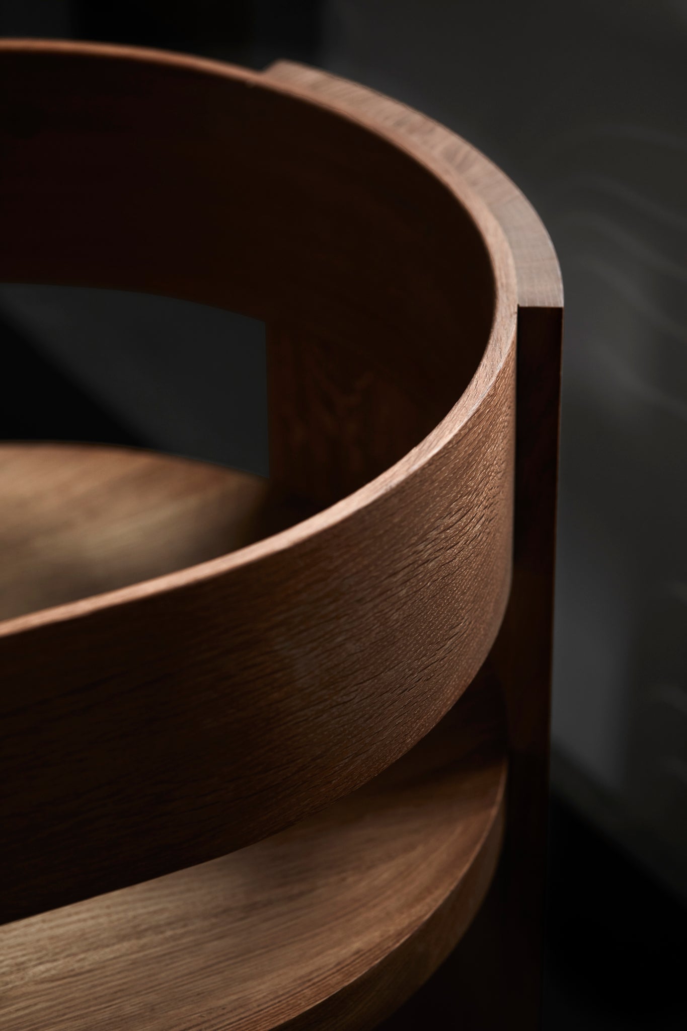 Its reflective design evokes a sense of honesty and simplicity. From the arch of the dining chair arises three legs that embrace the seat and backrest in a single movement. This simple aesthetic brings many complex design details, pushing the conventional limits of craftsmanship.The oak wood and walnut tree details are coated with a clear lacquer to protect and enhance its qualities. Lacquer creates a hard, durable surface resistant to scratches, dust, and dirt. The Collector Chair is part of the Collector series. It is also available without leather upholstery.