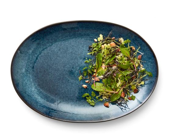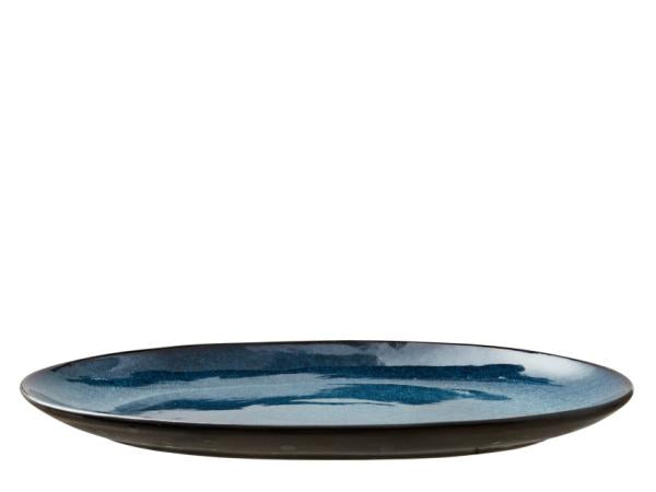 oval dish, 36 x 25 cm, in black stoneware with matt reactive glaze on the exterior combined with a beautiful shiny dark blue glaze on the inside. The dish is impressively beautiful for serving salads and snacks. Dishwasher-safe.