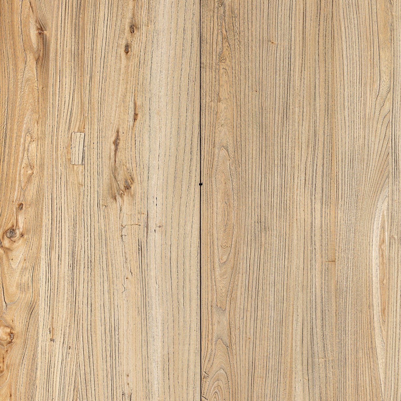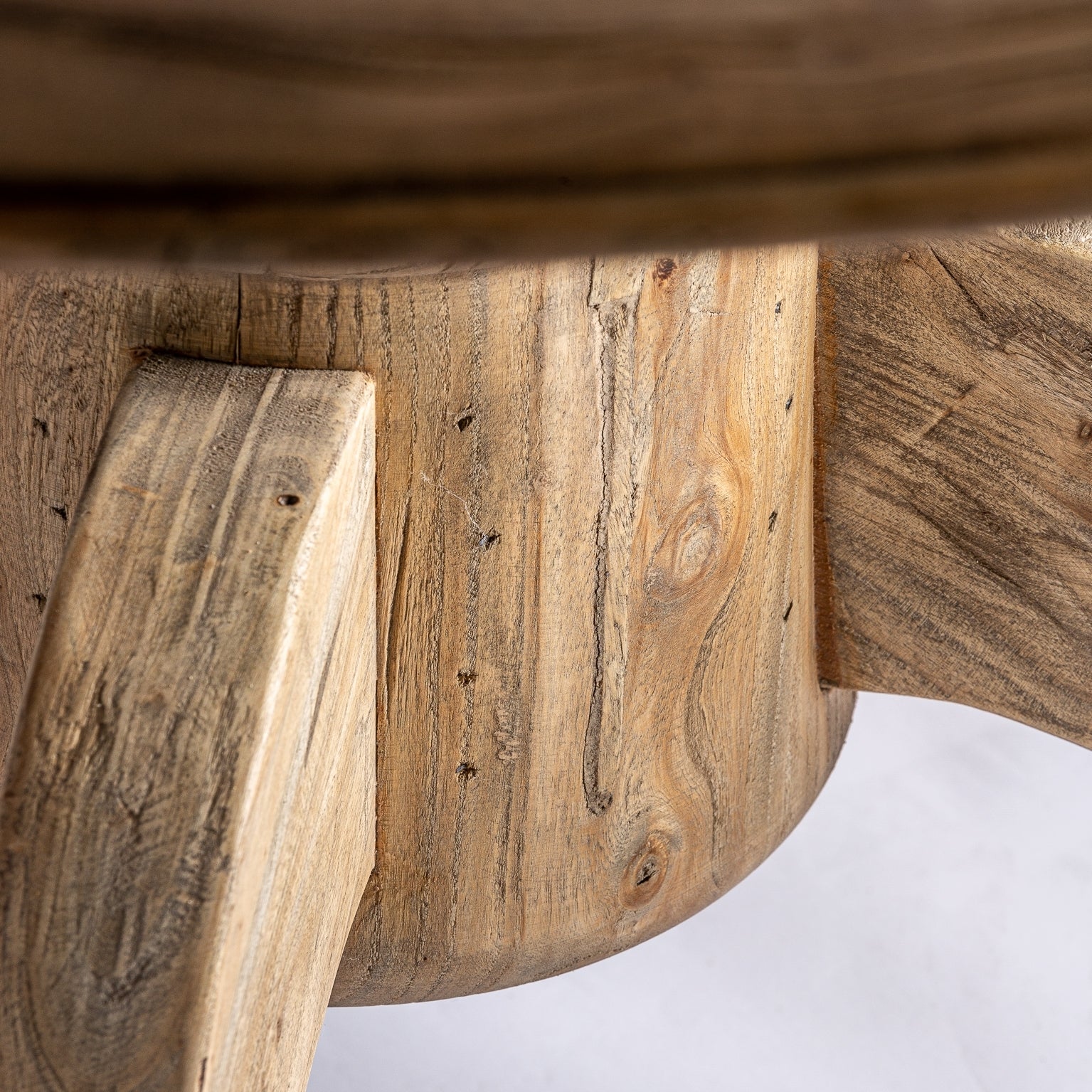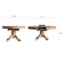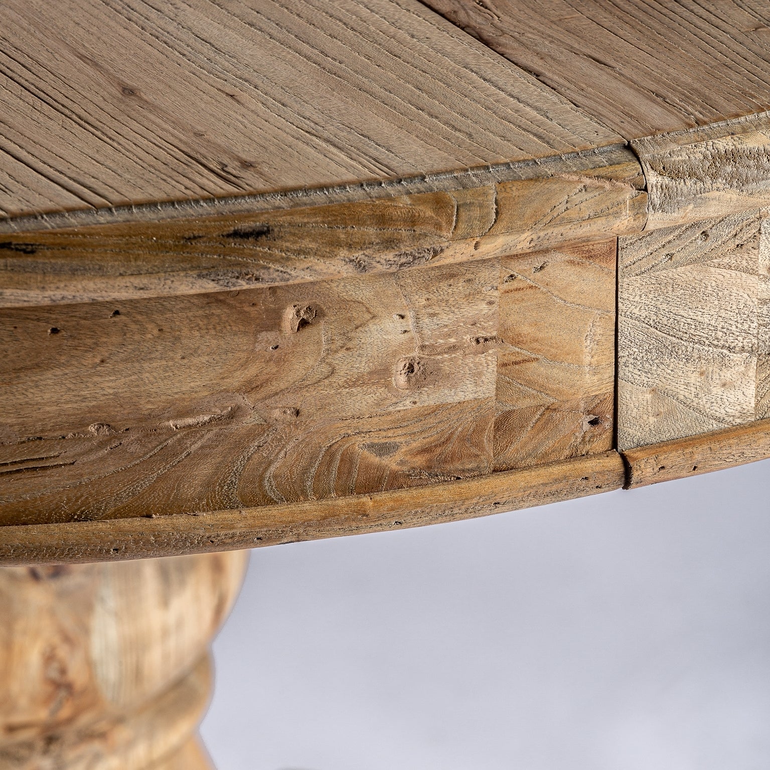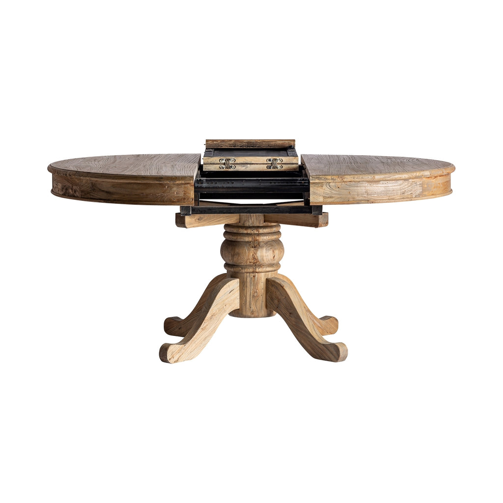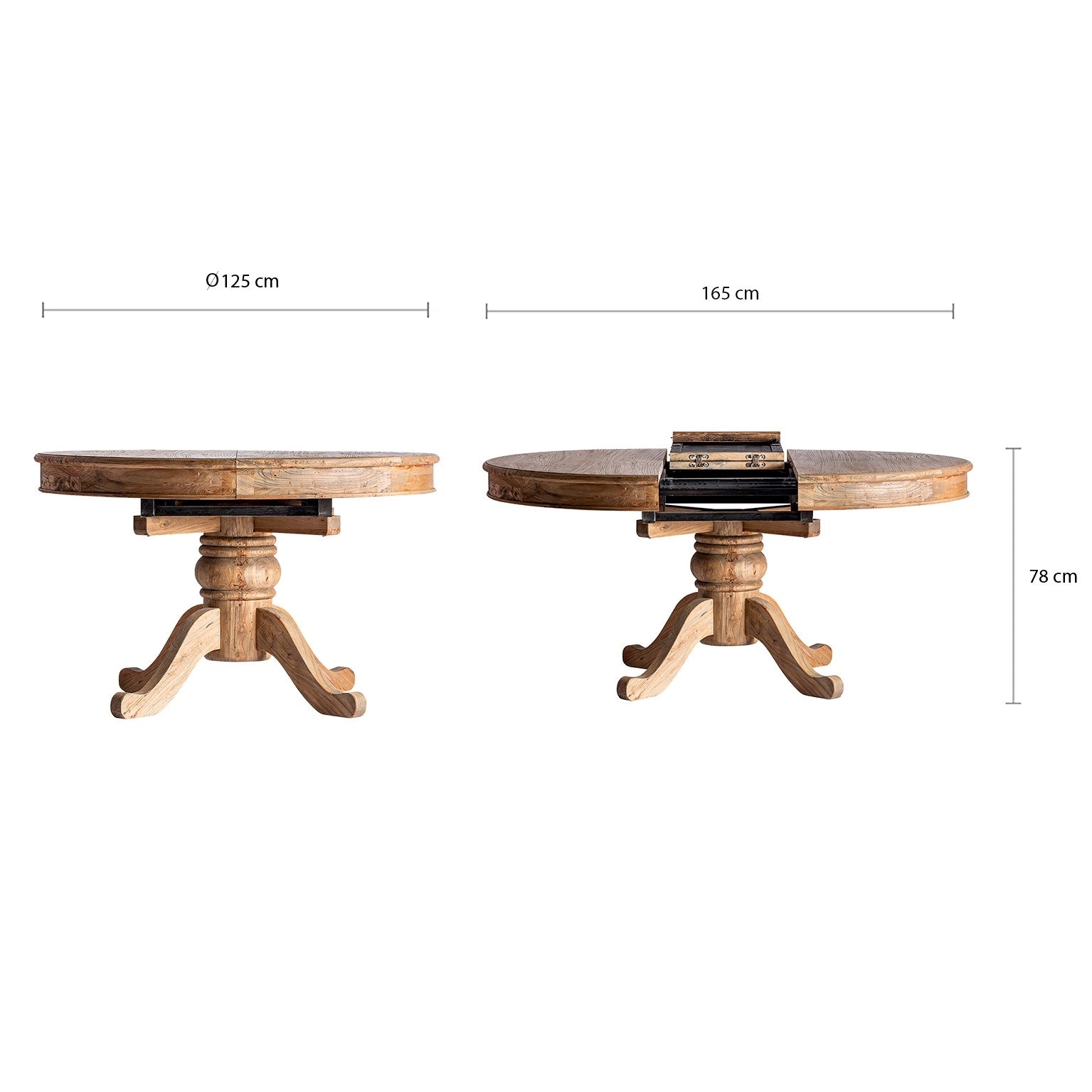 Extending table round berca, natural colour, classic style. Made of recycled elm tree wood. Detachable, extendable product.