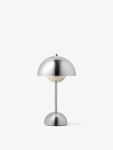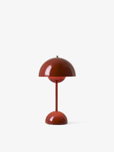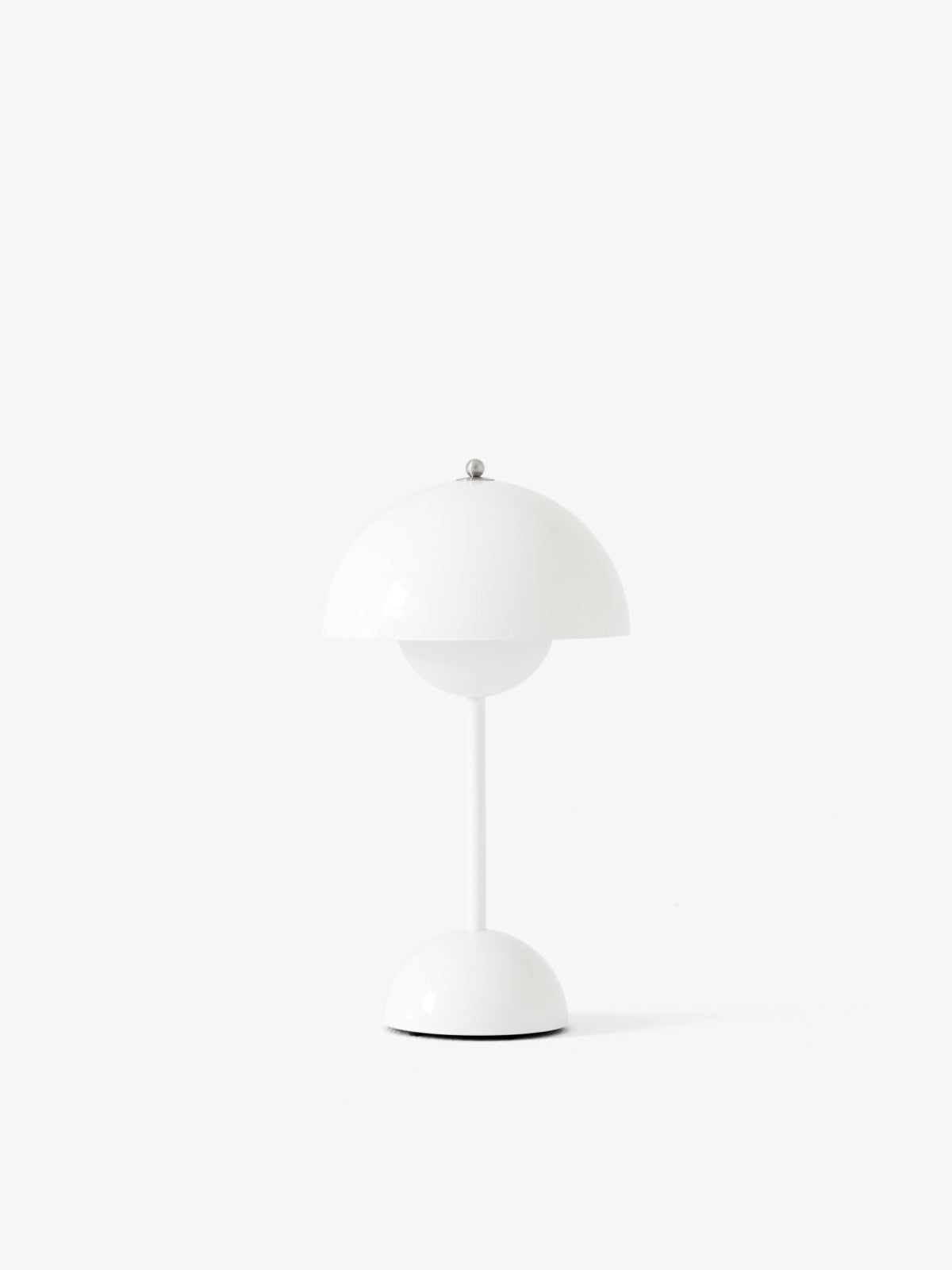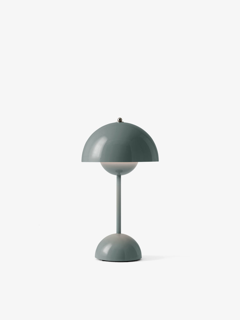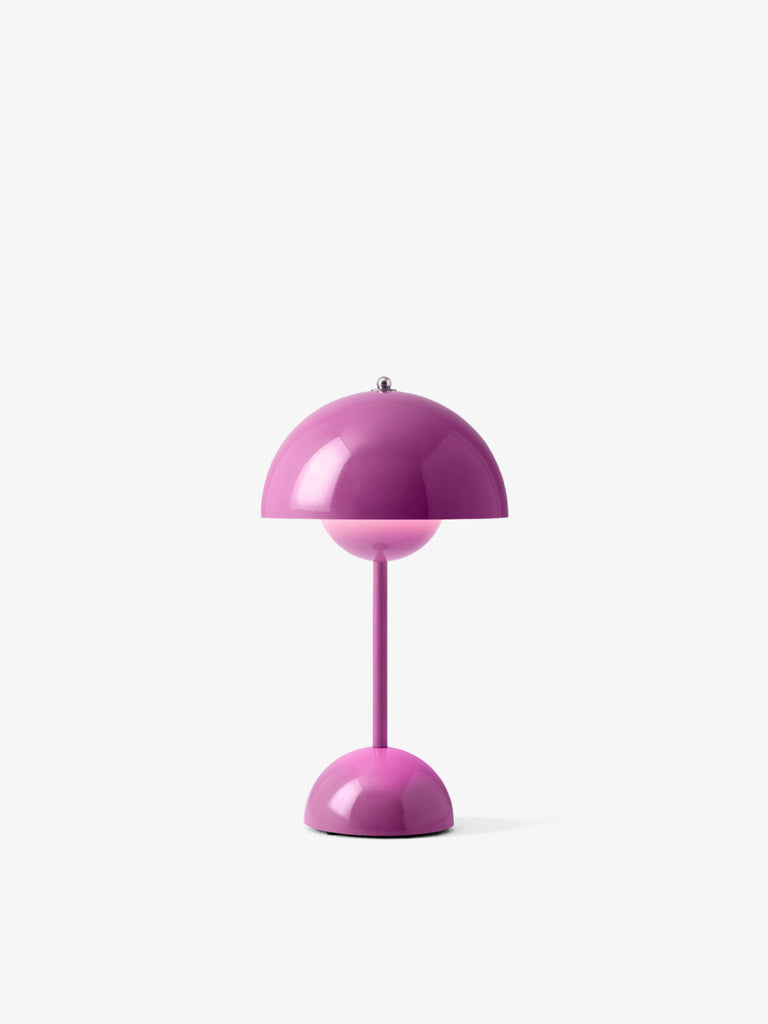 The Flowerpot, a vividly coloured lamp with a rounded pendant that hangs from the semi-domed upper shade, embodies the experimental attitude of Verner Panton. Slightly smaller in size than the table lamp version, and deliberately lightweight, the portable VP9 comes equipped with a USB charging cable. It is available in a wide range of contemporary colours and will bring a cozy atmosphere to indoor and outdoor settings.