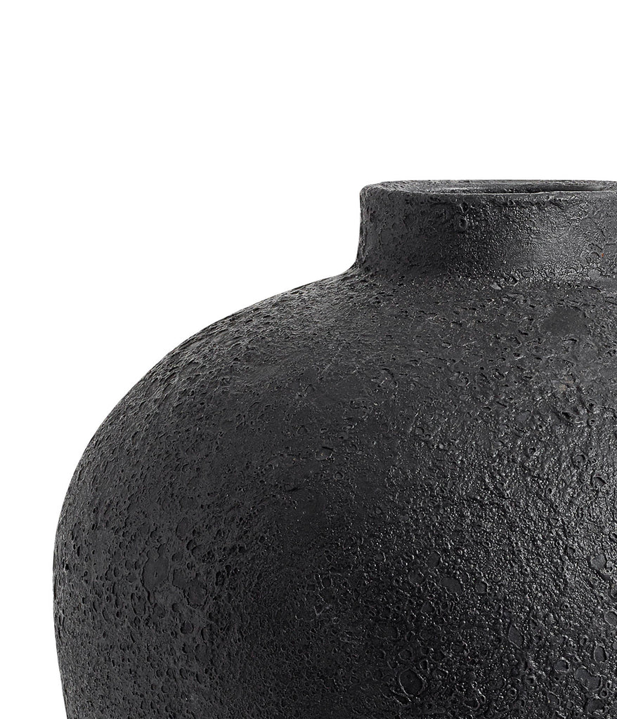 With its organic shape and rough surface, the Luna jar is a piece of unique art.The vase is made of terracotta, then hand painted and burned with a gas burner, to get the cool, crater-like effect in the glaze.With its rough and dark expression, Luna contrasts with the most bright colors in the interior, and will give your home a cool dispute.The vase should only be used indoor and there should not be planted in the vase. The vase are perfect for dried decorations or flowers.The Luna jar is 29 cm in diameter and the inner hole is 7 cm wide.