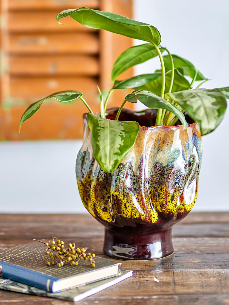 The Mahnoor Flowerpot by Creative Collection is an eye-catching flowerpot on foot with an organic look. The gorgeous flowerpot is hand-painted in a unique glaze with a running effect and warm earthy color hues. Each piece will vary and be one of a kind.