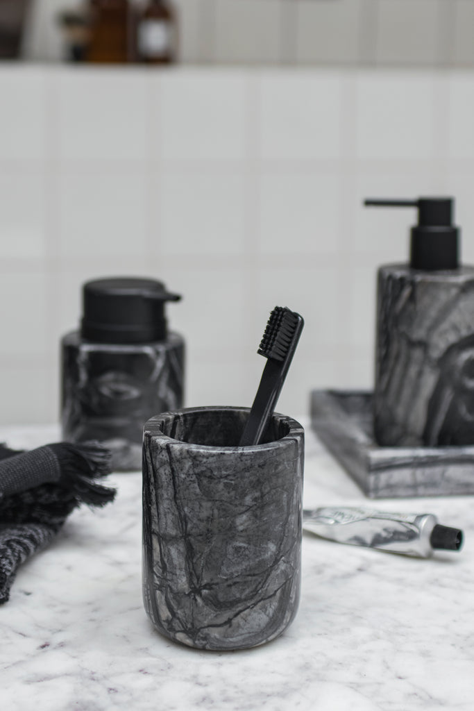 The MARBLE series is very robust and heavy, and these timeless marble pieces only gets more beautiful as time goes by. The toothbrush holder is perfect for toothbrushes, makeup brushes or perhaps a small plant that brings life into the bathroom. Combine the toothbrush holder with the other products from the MARBLE series for a beautiful and cohesive look in the bathroom.Size: Ø7,5 x H10 cmMaterial: MarbleCare instructions: Wash by hand or use a damp cloth. We recommend alm. dishwashing liquid. Do not use acidic cleaning agents. The product is not suitable for the dishwasher.