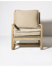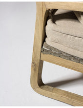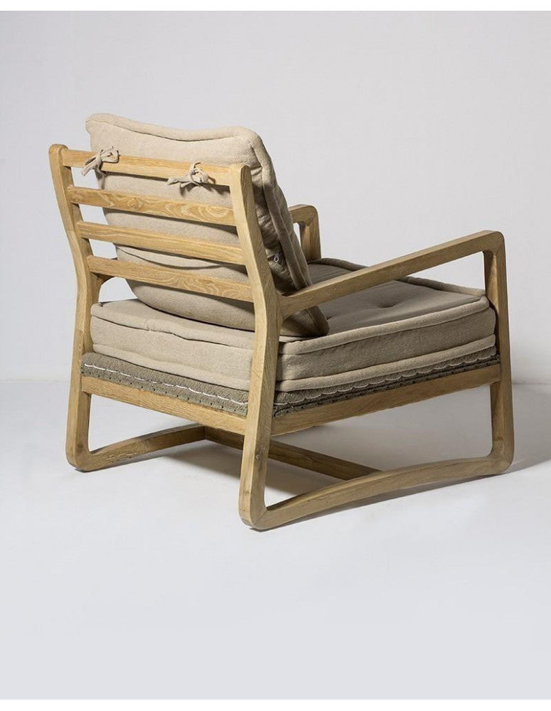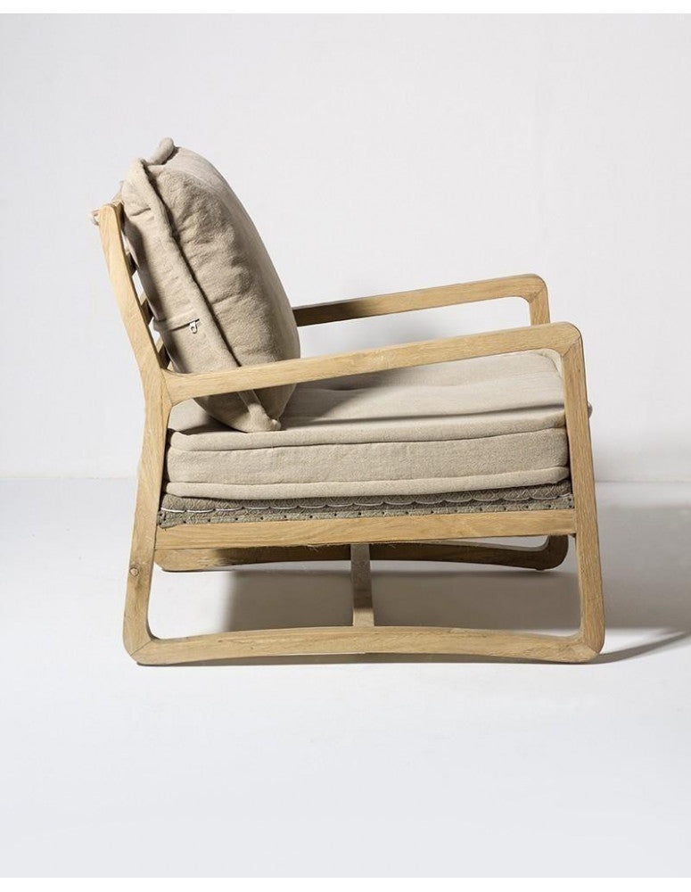 Oak wood in natural colour Ecru colour linen cushions included Seat height: 42 cm 68x83xH77 cm Natural oak armchair with exposed wooden frame and seat and back cushions in ecru. It highlights its sinuous and flowing shape of the legs and armrests. Its balanced simplicity brings elegance and agelessness to your living room or reading corner.