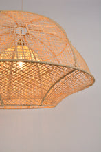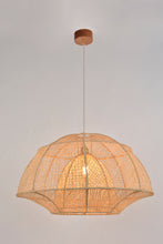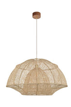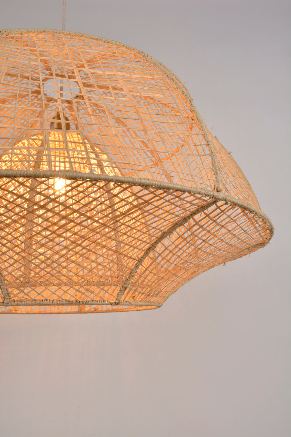 Dome-shaped suspension in hand-woven natural raffia. Equipped with a textile cord, a brass cup and an adaptable wooden bell DCL.