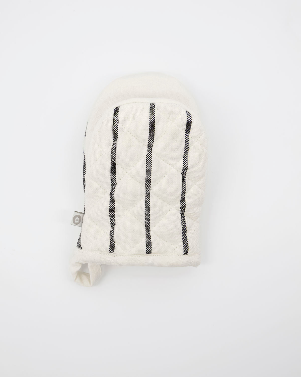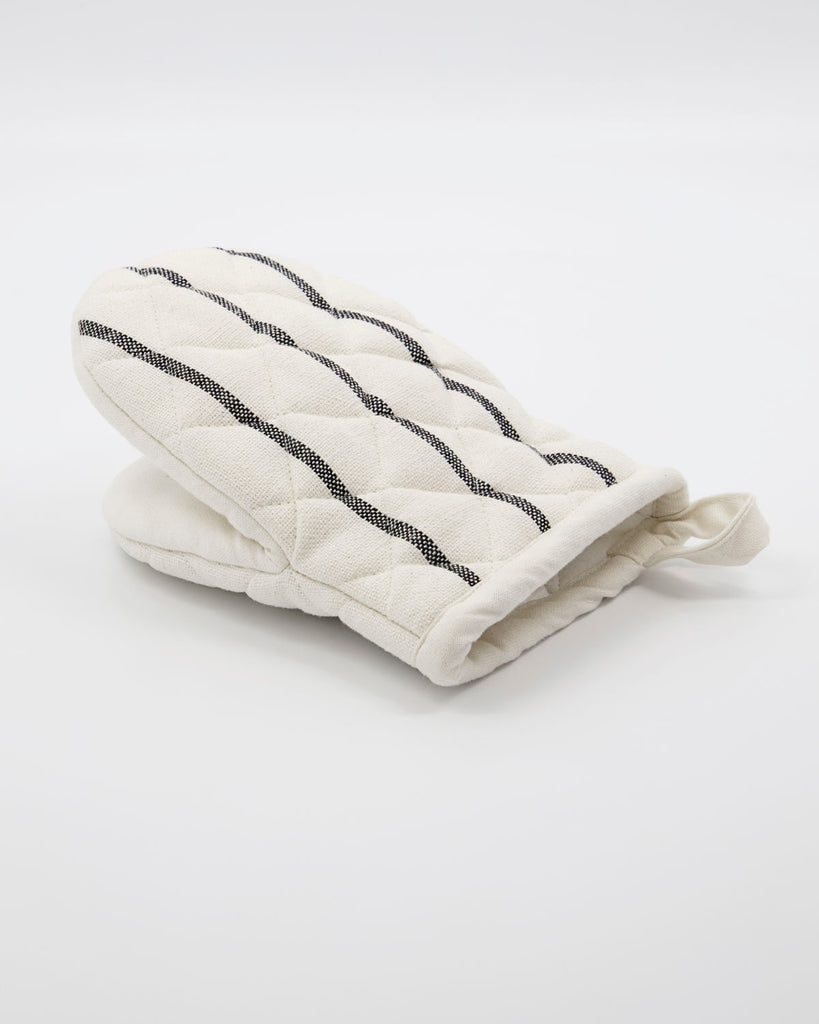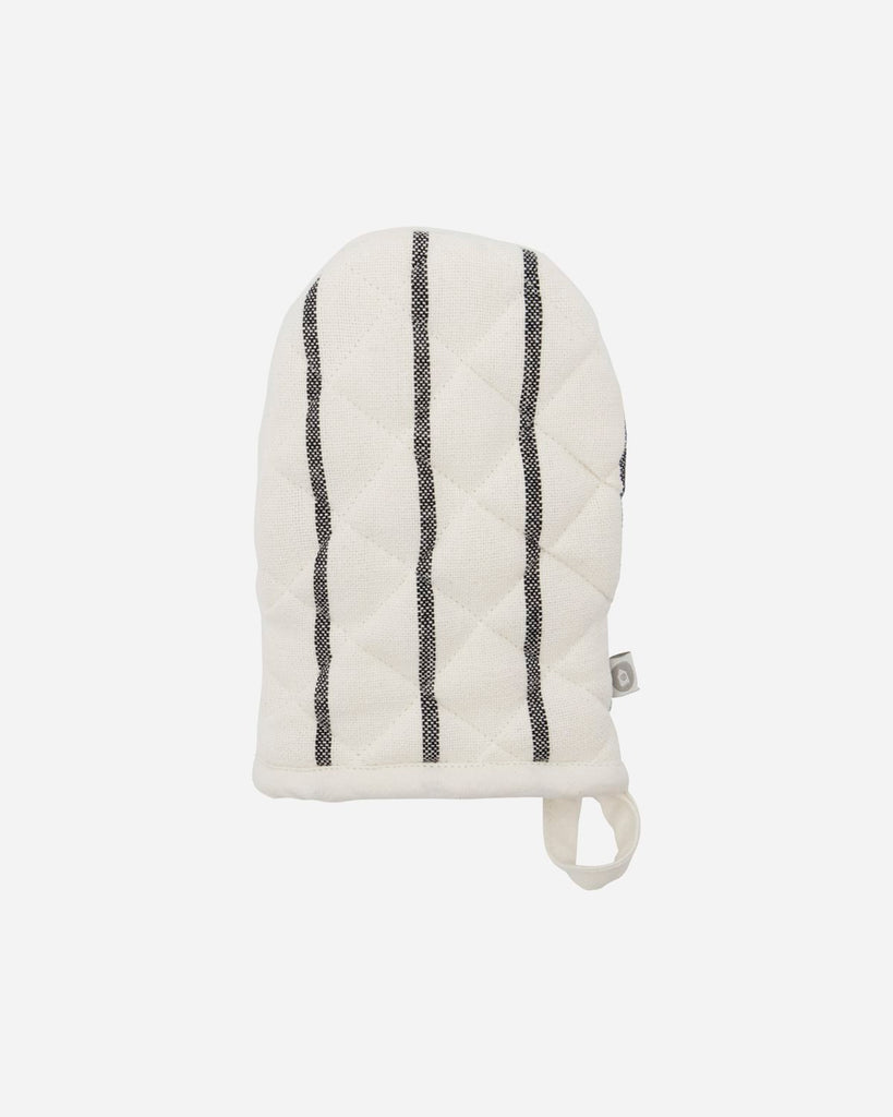 l: 14 cm, w: 20 cm   Get dinner safely out of the oven with this oven glove called Dry. Made of OEKO-TEX® 100 certified cotton, the quilted design gives the glove a thick quality that protects your hand from the heat. With the black stripes on a white background, the look is a timeless and stylish addition to your kitchen décor. You can wear the glove on either hand, thanks to the clever design with two equally large compartments. Complete your range of kitchen textiles with the apron in the same design.