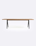 To achieve an extremely sturdy table with an incredibly light appearance. This is the idea behind the design of the LIKU table. By mitering the long side of the tabletop, the thickness of the solid edge is gradually reduced until it becomes an edge that, when viewed from the side, gives the illusion of a floating sheet. The arrangement of its double iron leg in the shape of an inverted V guarantees good stability and comfort for all its users. Width: 90 cm Depth: 200 cm Height: 75 cm Delivery in 3-4 weeks