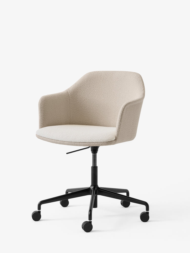 Product Details Product categoryUpholstered armchair Production processShell made from 100% recycled polyprolene with 15% fiber glass. Upholstered seats are made with a veneer plate with 30mm foam. Aluminium swivel base with castors. Indoor MaterialPolyproplylene, glass fiber, HR foam, upholstery, aluminum swivel base with castors. UpholsteryAvailable in a variety of fabrics.Made to order (3-6 weeks).COM must be approved by &Tradition to ensure suitability for upholstery. Base finishesBlack, Polished AluminiumMatching castors & gaslift. Suitable for all floor types. DimensionsH: 78cm/31.2in – 92cm/36.8in, W: 66cm/26.4in, D: 66cm/26.4inSeat height: 42cm/16.8in – 56cm/22.4inArmrest height: 68cm / 26.8in WeightHW55: Product: 11kg / Incl. packaging: 15kgHW56: Product: 12.1kg / Incl. packaging: 16.1kgHW57: Product: 12.1kg / Incl. packaging: 16.1kg Packaging dimensionsH: 82cm/32.8in, W: 68cm/27.2in, D: 68 cm/27.2in Strength, durability and safety testingThe chair is tested for strength, durability and safety according to: – EN 16139 Level 2 – Extreme use.