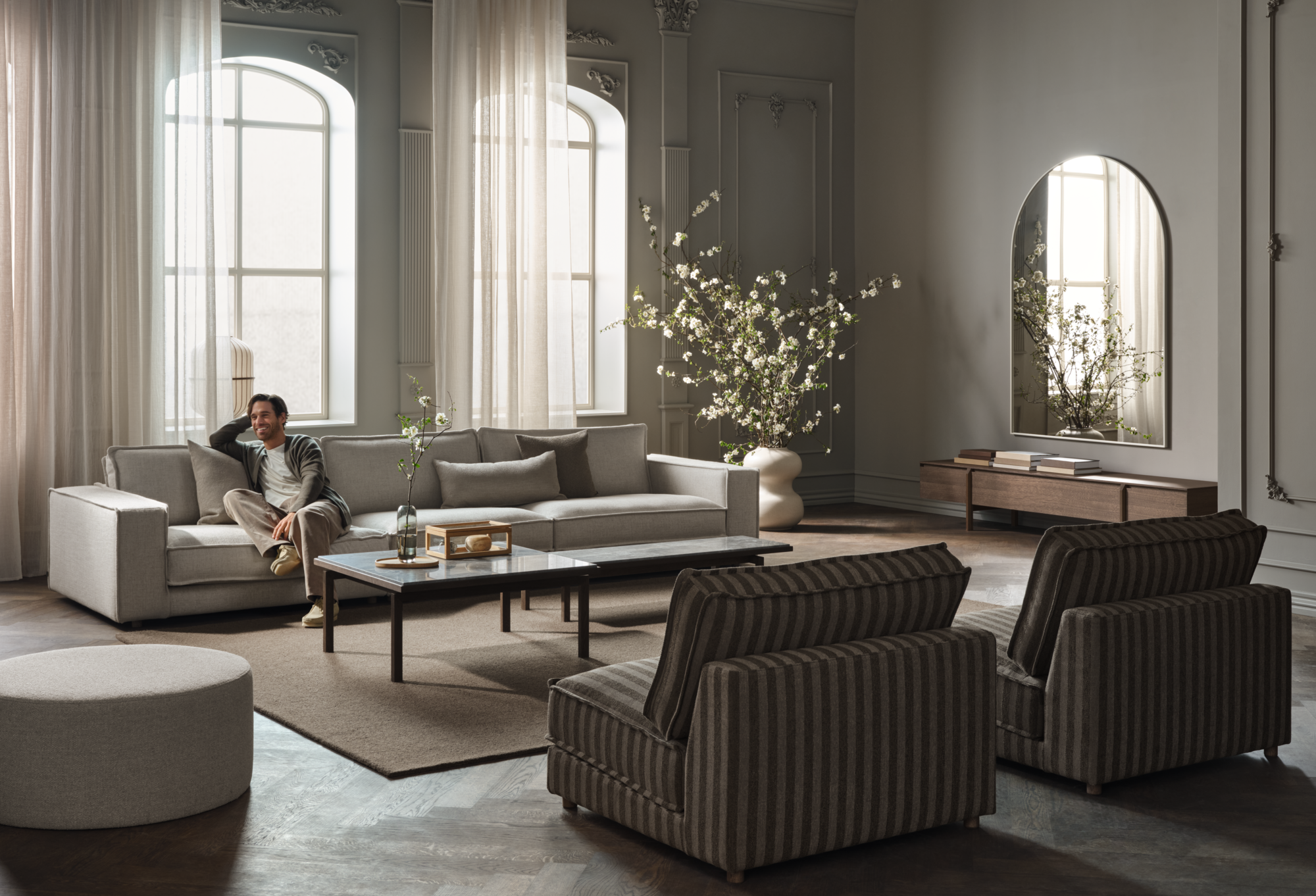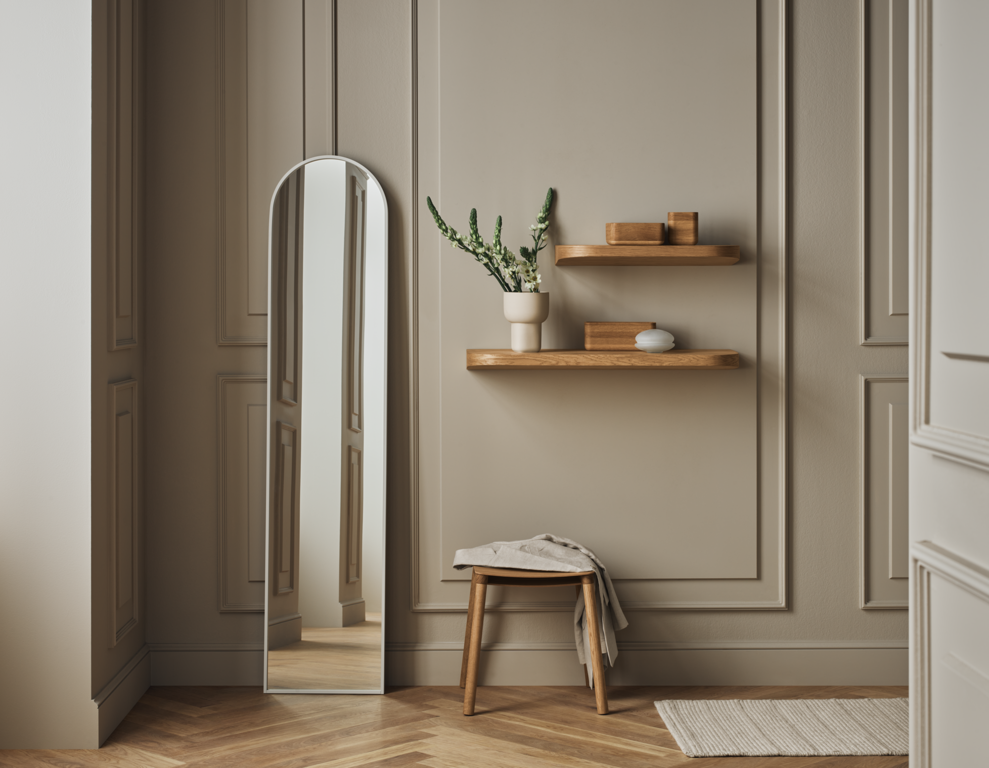 Ripple is a series of beautiful mirrors with an architectural gaze. Each mirror is inspired by the semi-circular arched windows that suited the Romanesque era. A subtle imitation with an elegant modern touch. The mirrors are designed to work as independent standalone pieces and as a creative row of reflecting mirrors. Made from elegant and durable materials, Ripple will dress your interior for years to come.