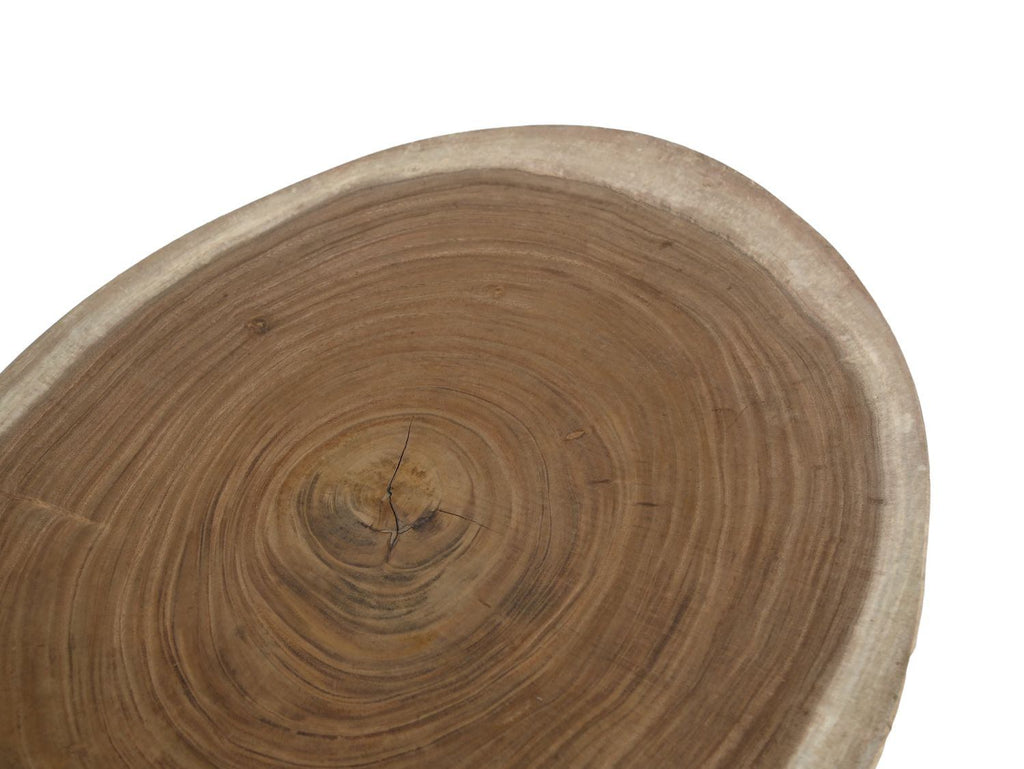 This tree trunk table top is made of munggur wood and contains many natural wood shapes and patterns, which provide a characteristic table top in a beautiful natural shape. Each tree trunk table top is unique, which means that you bring a beautiful, unique object into your home. This table top has a diameter of 80 cm and has a free shape. Please note: this piece of furniture is handmade and therefore unique. The munggur wood can differ in color and there may be small irregularities on the blade. The tabletop is not treated with a protective varnish as standard and is not pre-drilled. For protection against spills, you can treat the top (both on the top and bottom) with the Natural Wood Protector 2k.