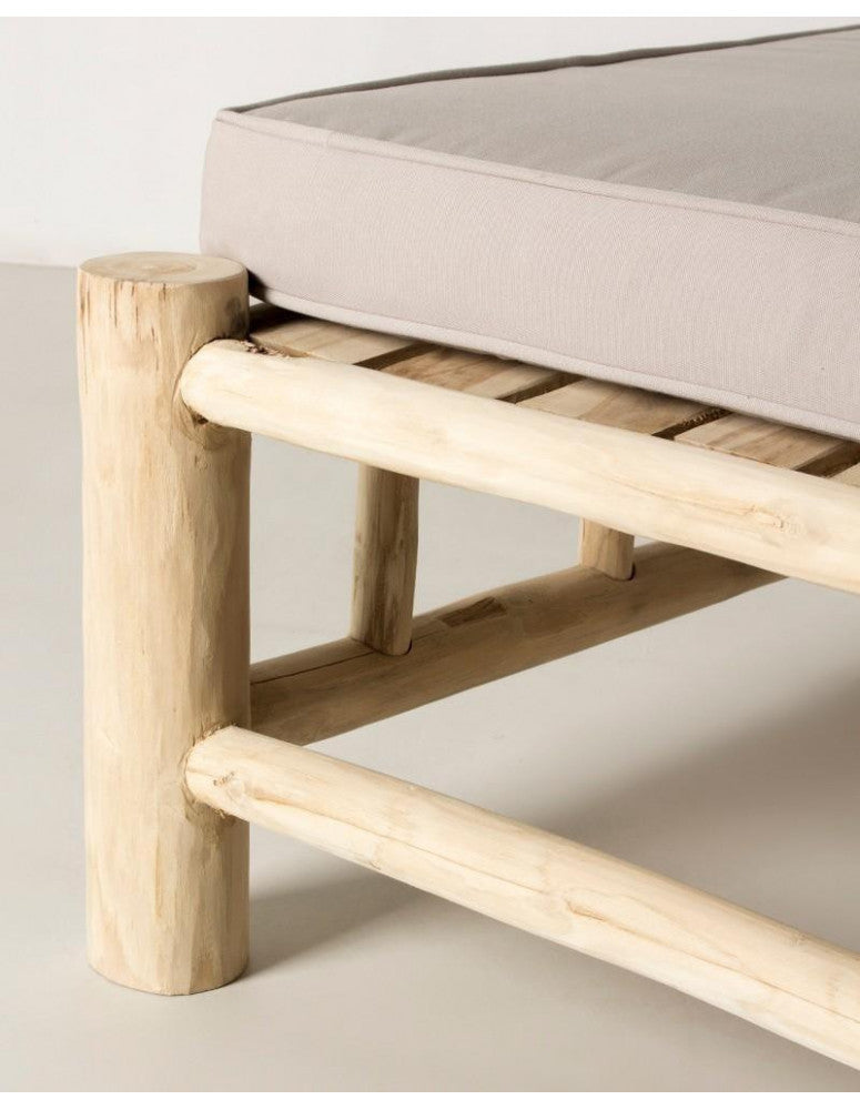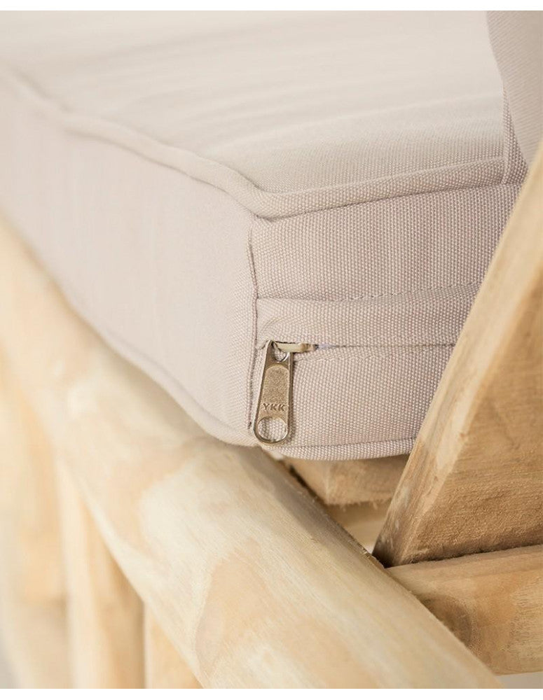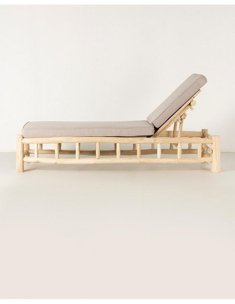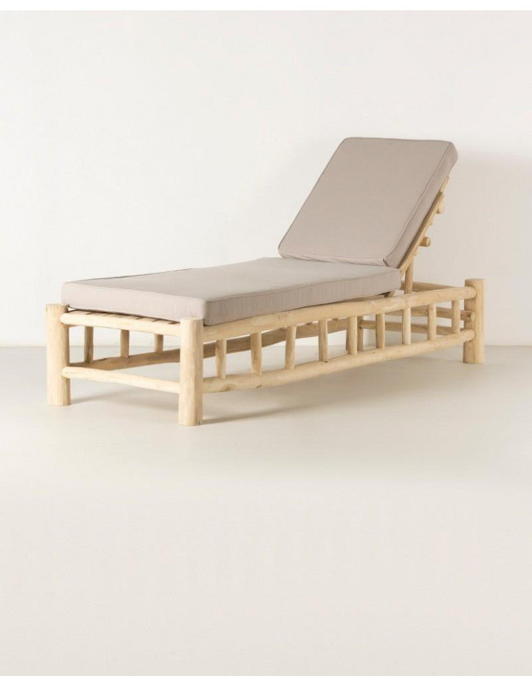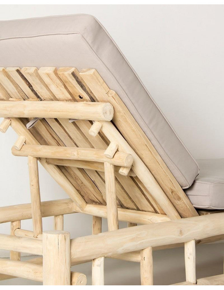 Reclining sun lounger in natural teak wood, with sand-coloured canvas cushions and high-density foam. A sturdy and resistant piece that, thanks to its neutral tones and simple lines, will fit in perfectly with the rest of your outdoor furniture. The reclining seat and soft cushions that complement the lounger will add that extra comfort to your rest. The sun lounger will become the star of your terrace, garden or patio decoration, creating your most exotic outdoor set. Enjoy a well-deserved nap or simply relax, lying down, watching a beautiful sunset.