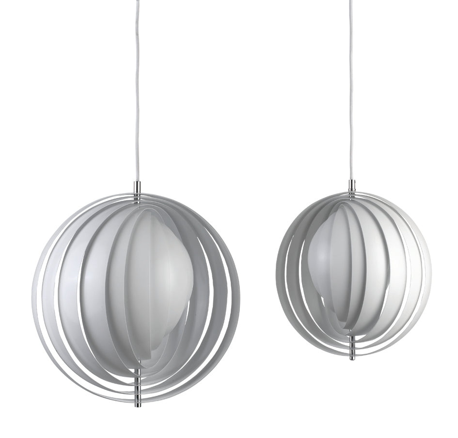 Designed in 1960, the Moon represents one of Verner Panton’s earliest designs in lighting. The iconic pendant is characterized by its fan-like design with ten ring-shaped lamellae perfectly positioned to provide a soft, ambient and glare-free light. The blades reflect and filters the light and the pendant changes its appearance depending on the angle at which you view it.
